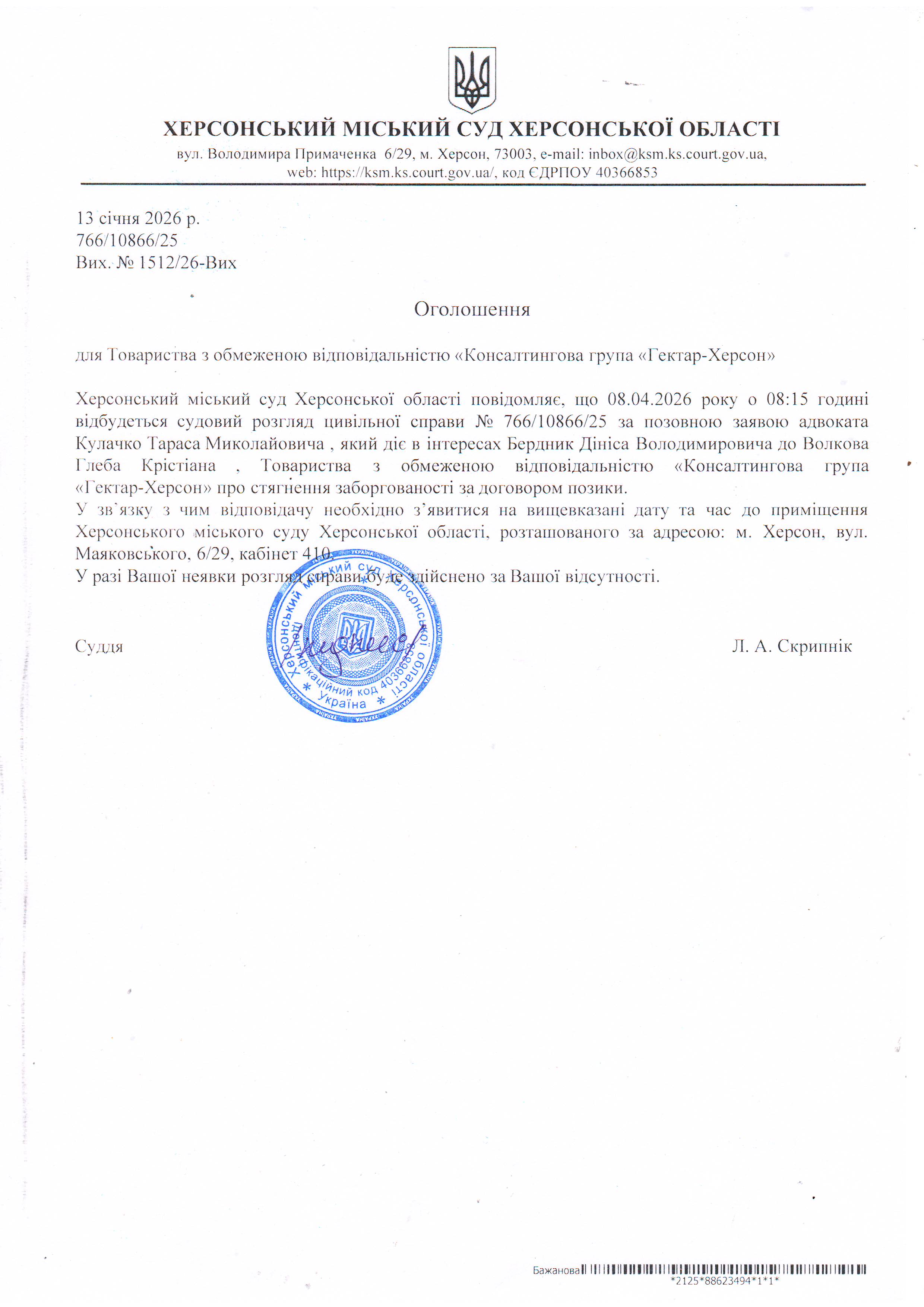 Оголошення для ТОВ "Консалтингова група "Гектар-Херсон"