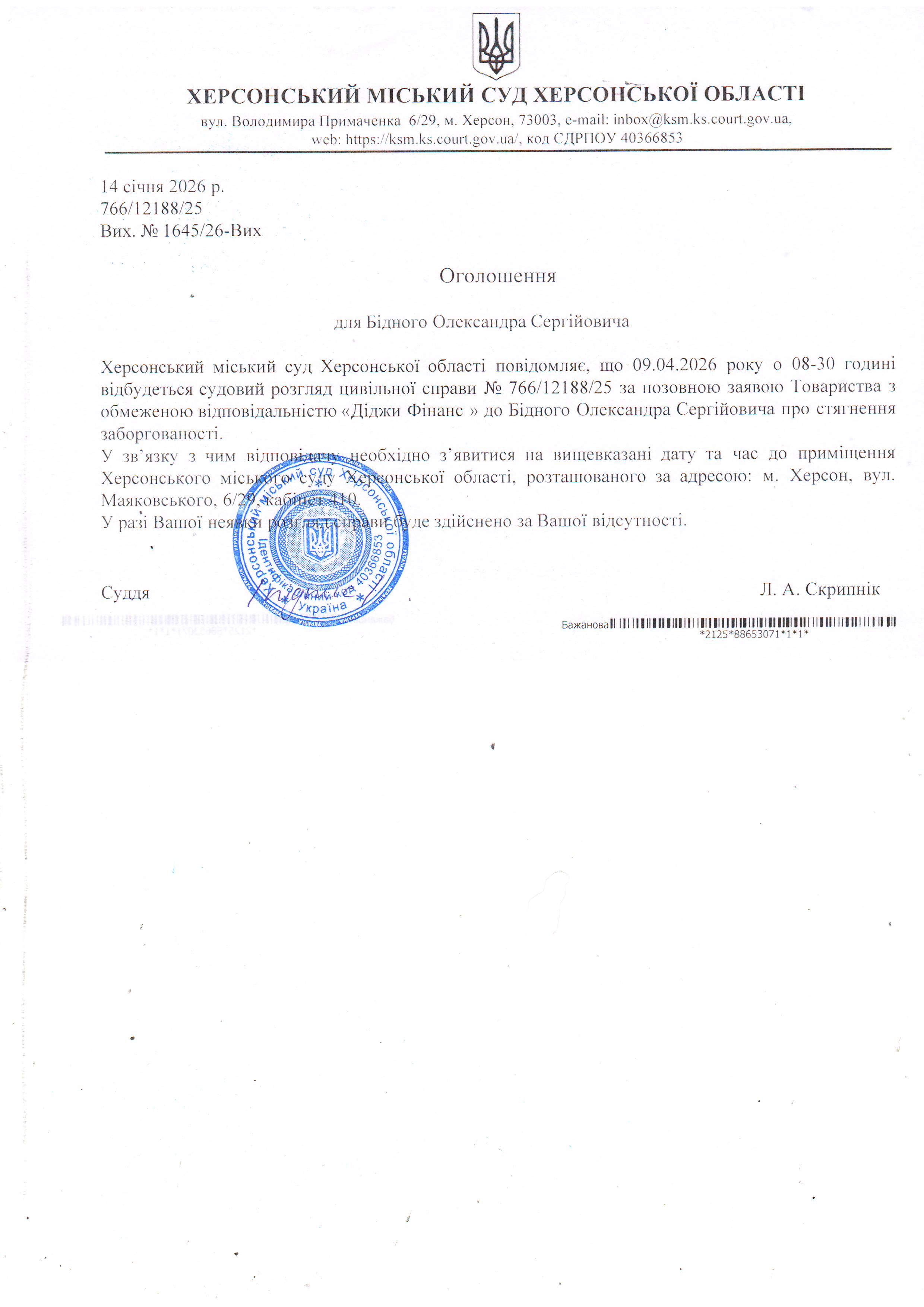 ОГОЛОШЕННЯ ПРО ВИКЛИК ДО СУДУ