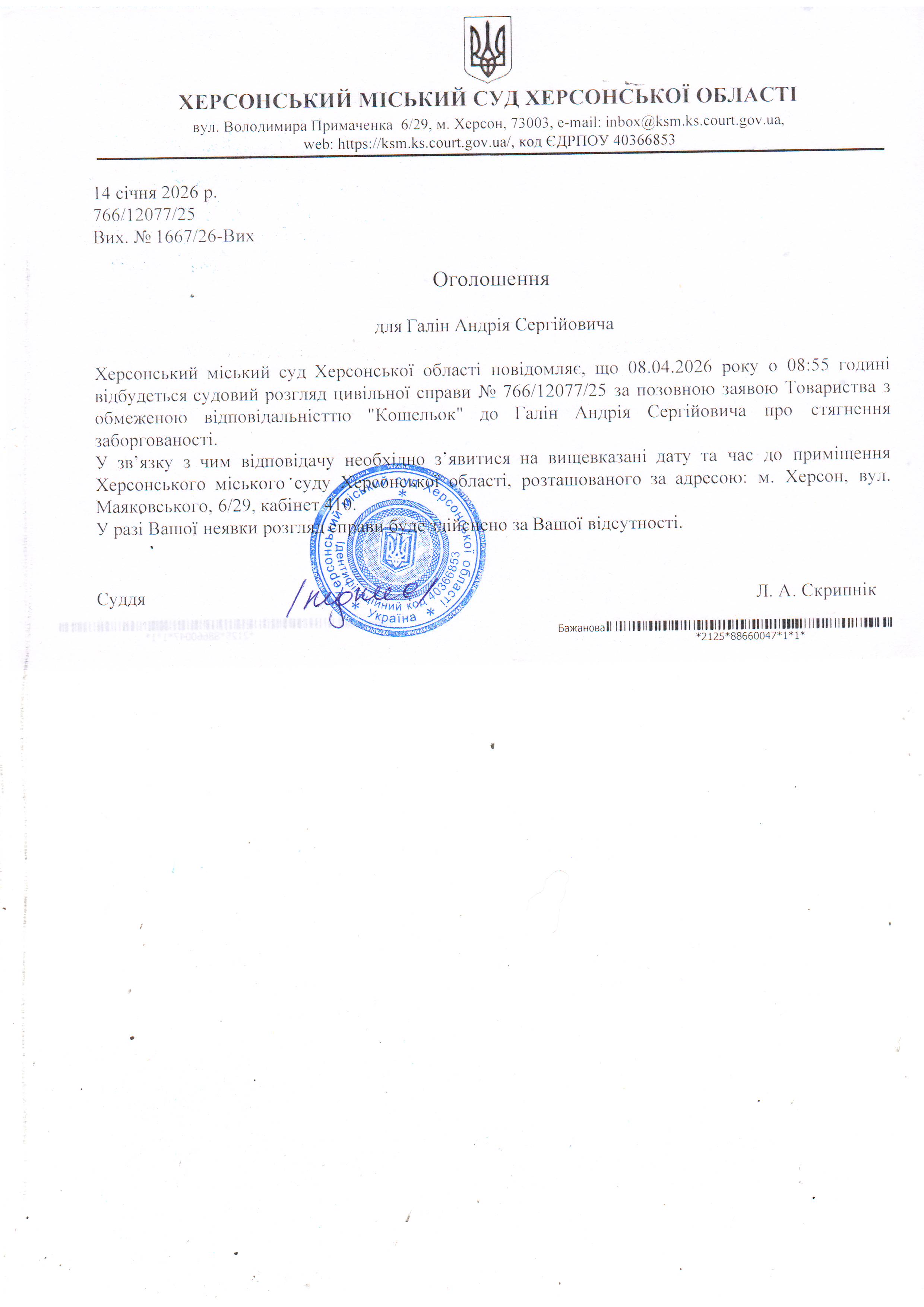 ОГОЛОШЕННЯ ПРО ВИКЛИК ДО СУДУ