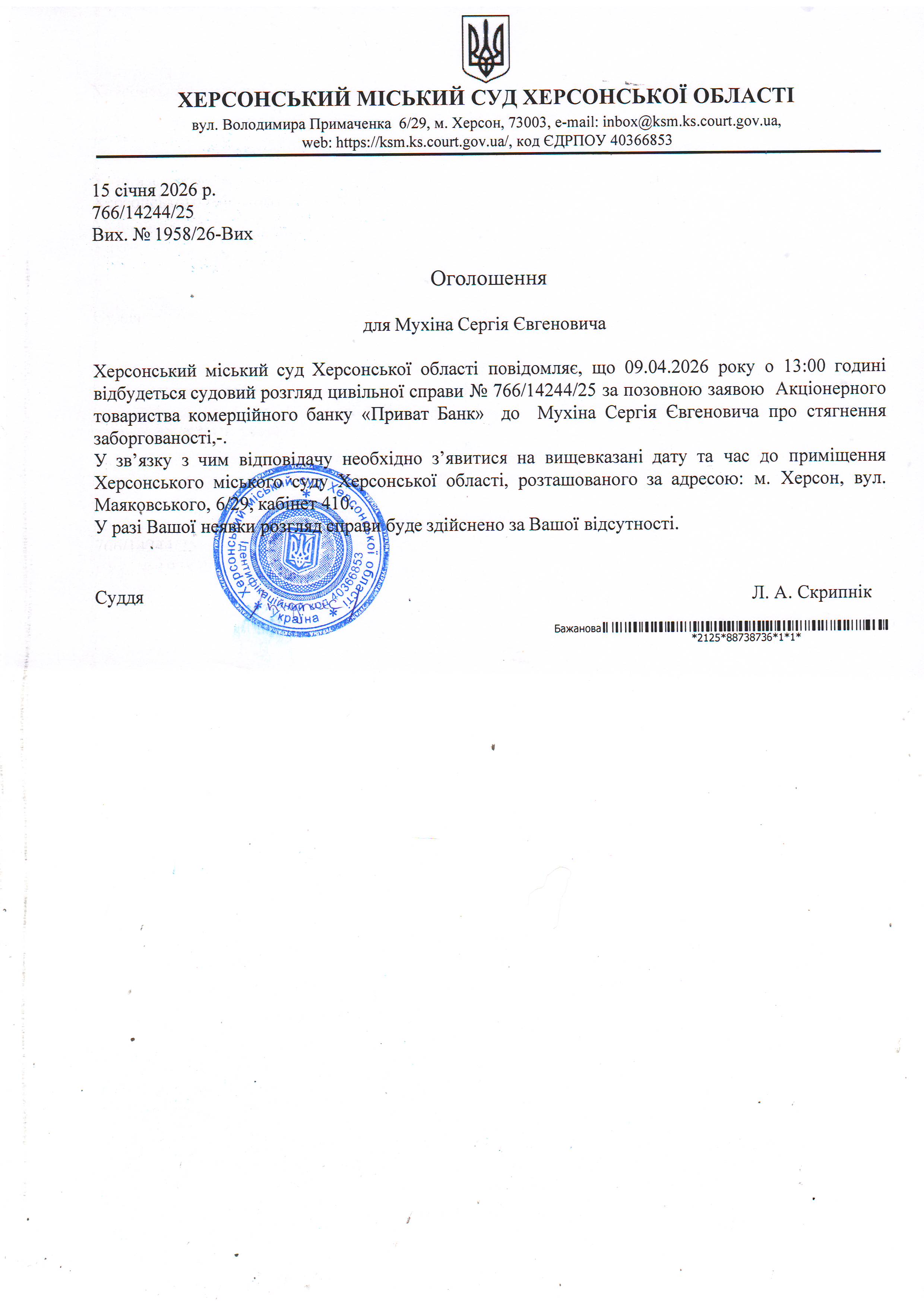ОГОЛОШЕННЯ ПРО ВИКЛИК ДО СУДУ