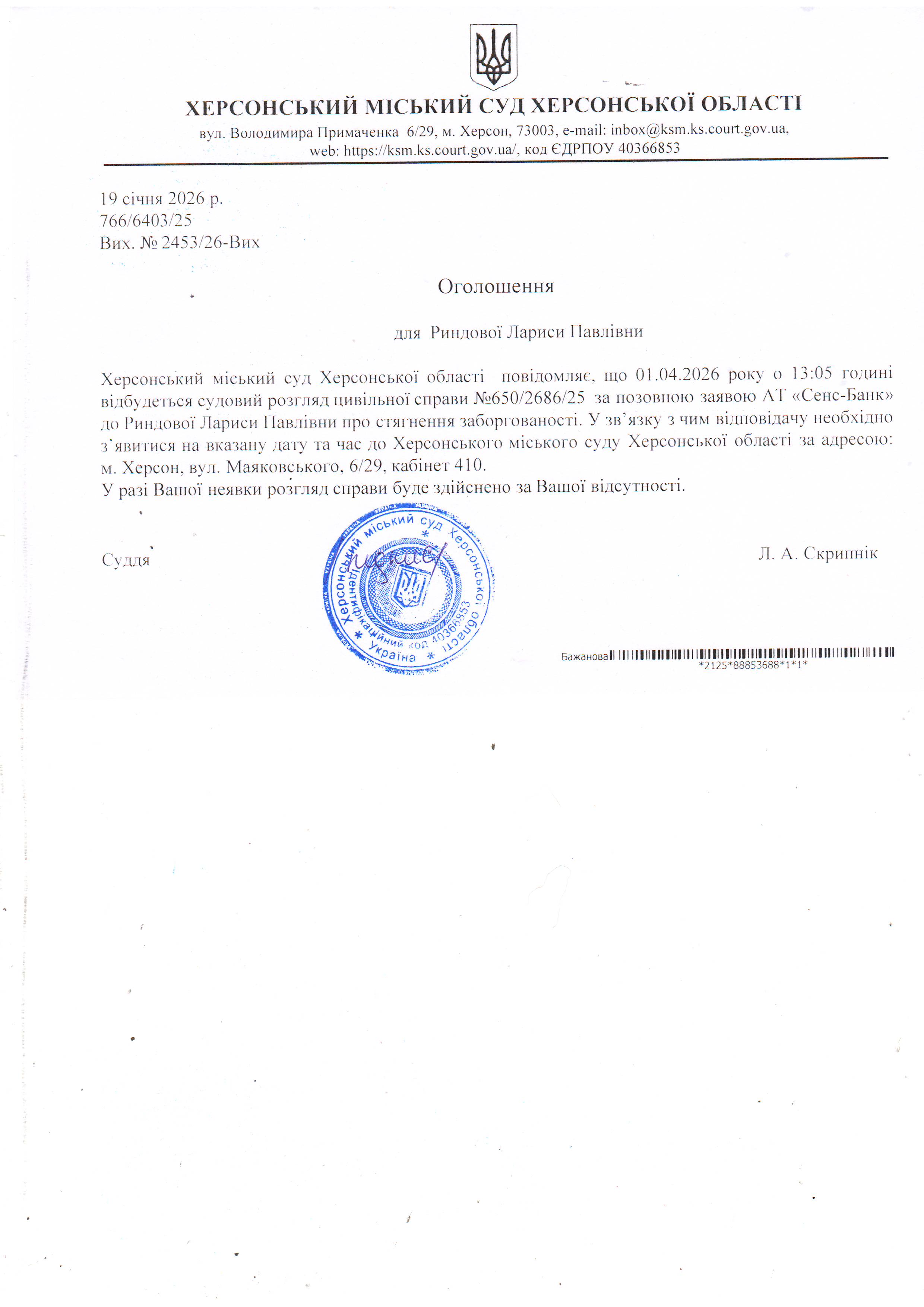 Оголошення для Риндової Лариси Павлівни