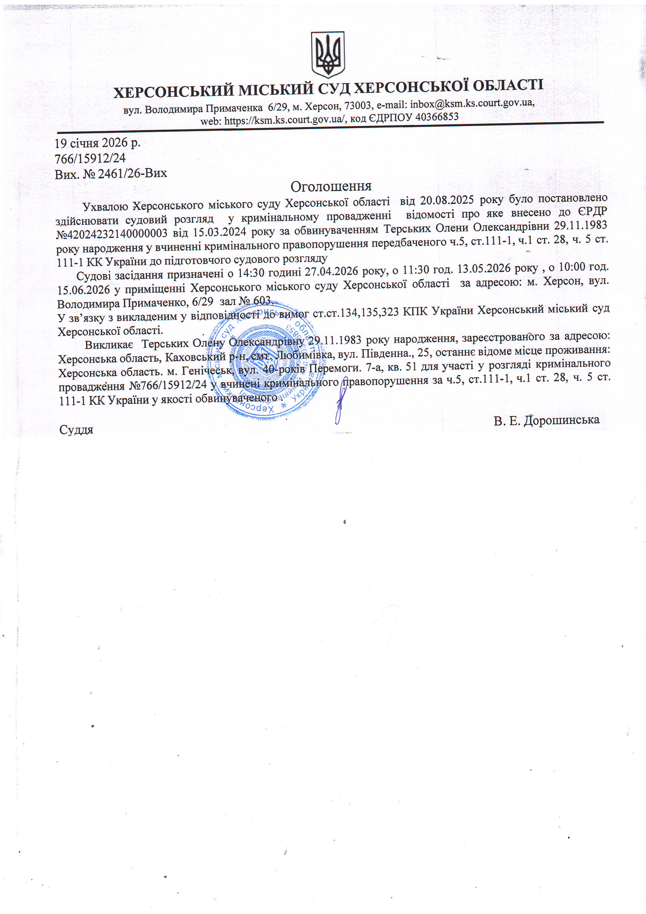 Оголошення для Терських Олени Олександрівни