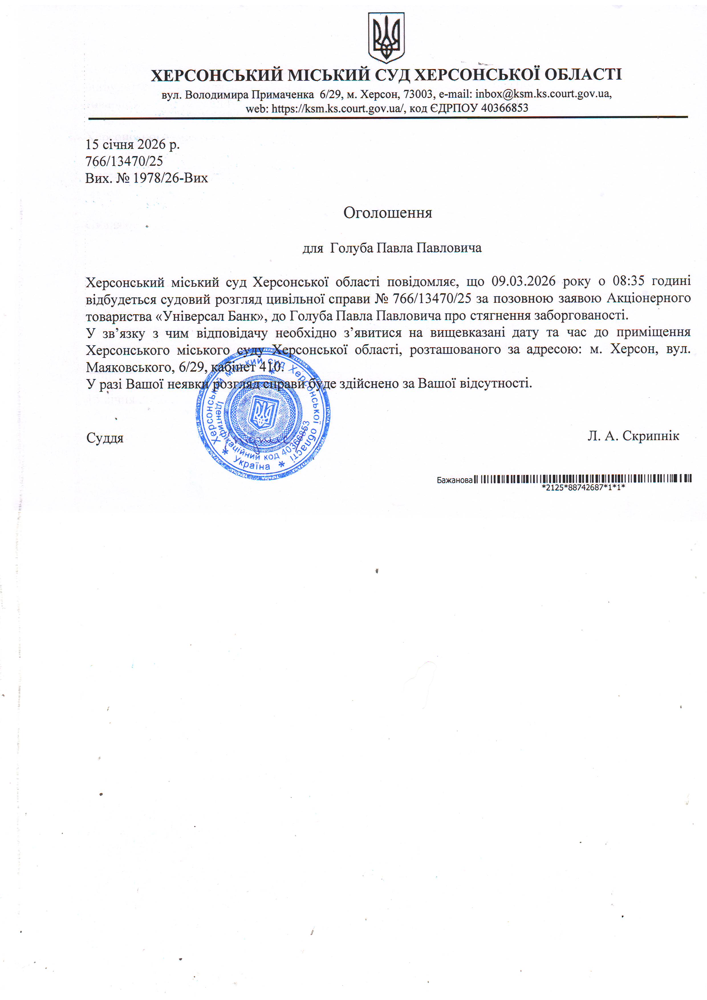 ОГОЛОШЕННЯ ПРО ВИКЛИК ДО СУДУ