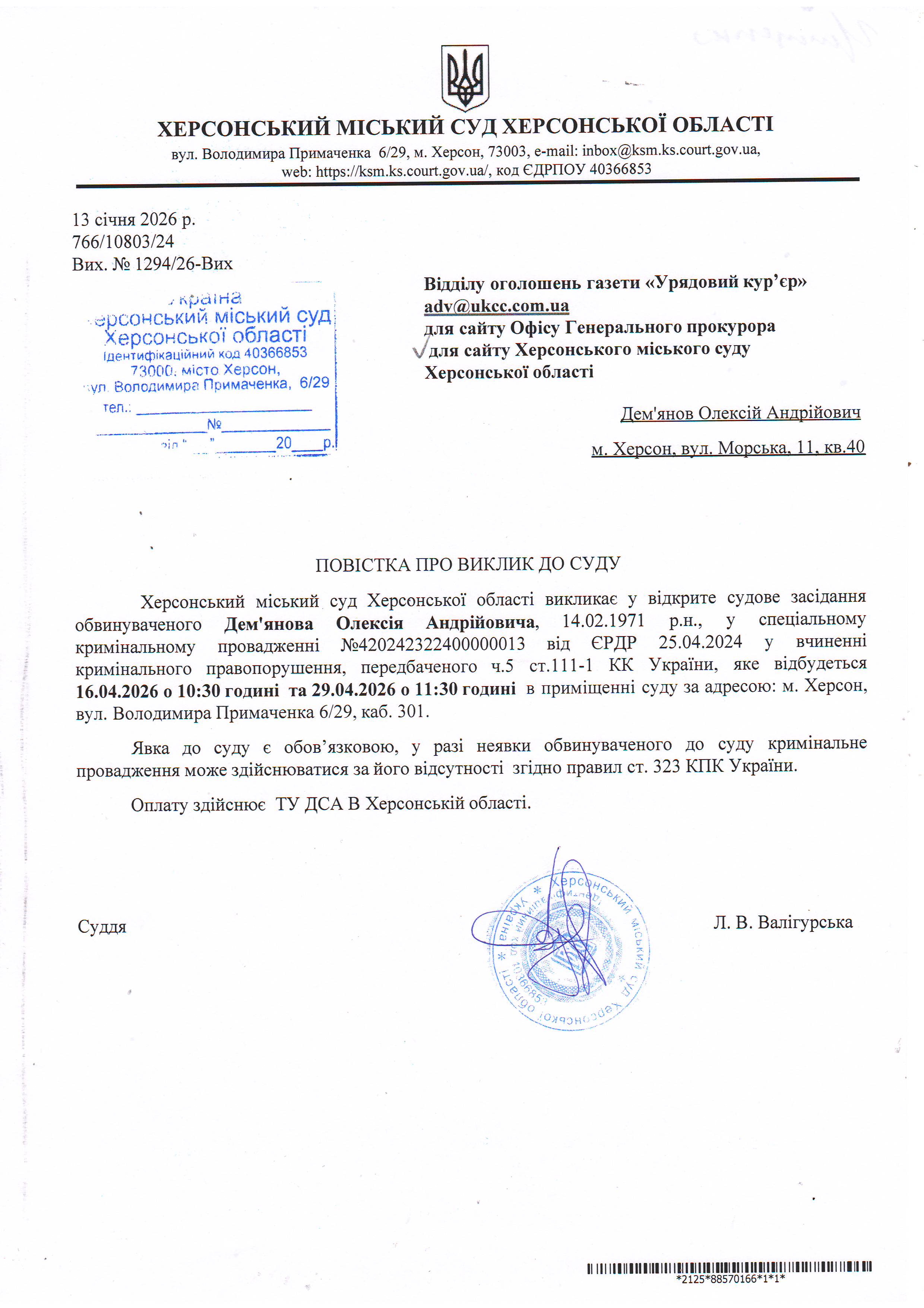 ОГОЛОШЕННЯ ПРО ВИКЛИК ДО СУДУ