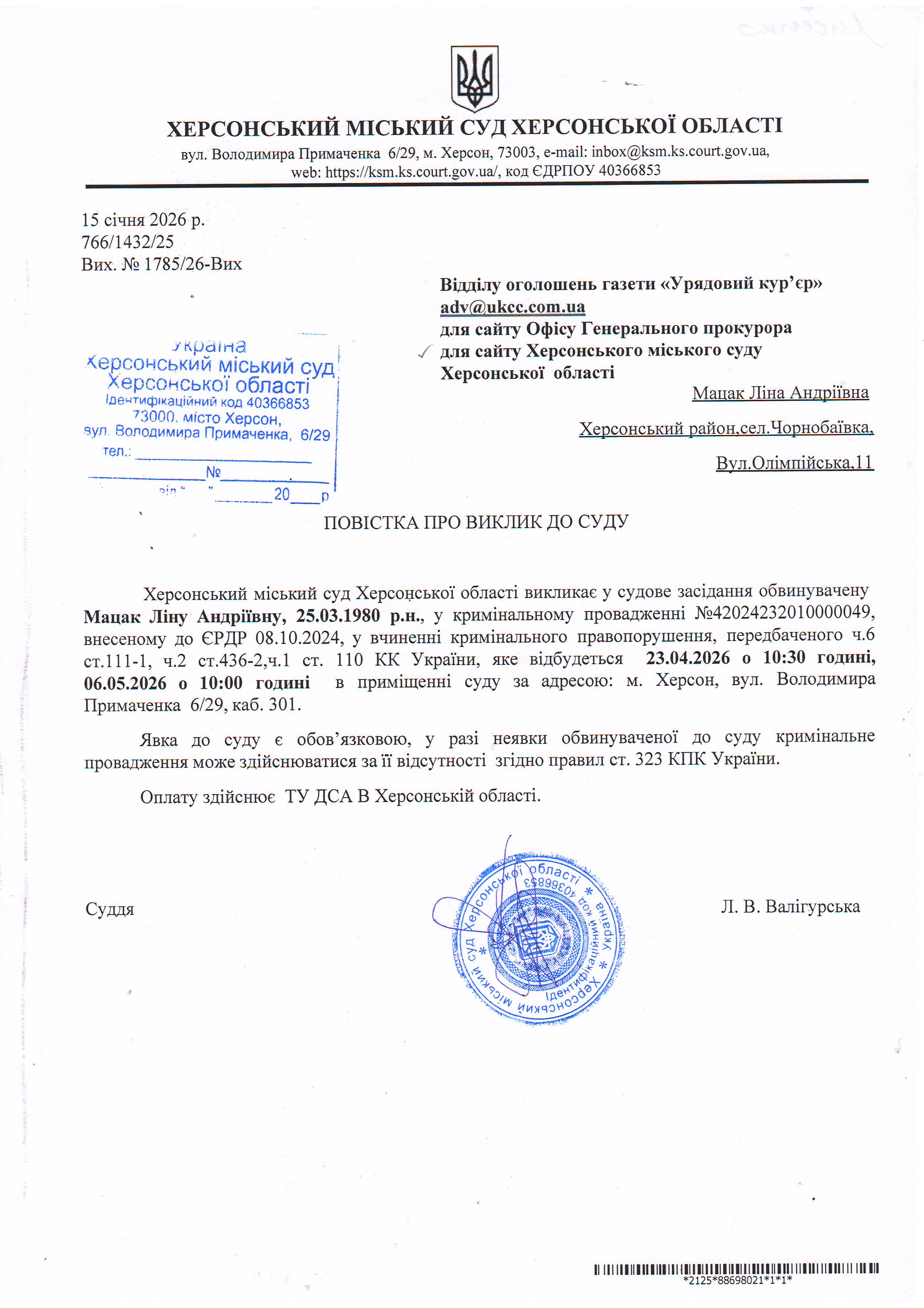 ОГОЛОШЕННЯ ПРО ВИКЛИК ДО СУДУ