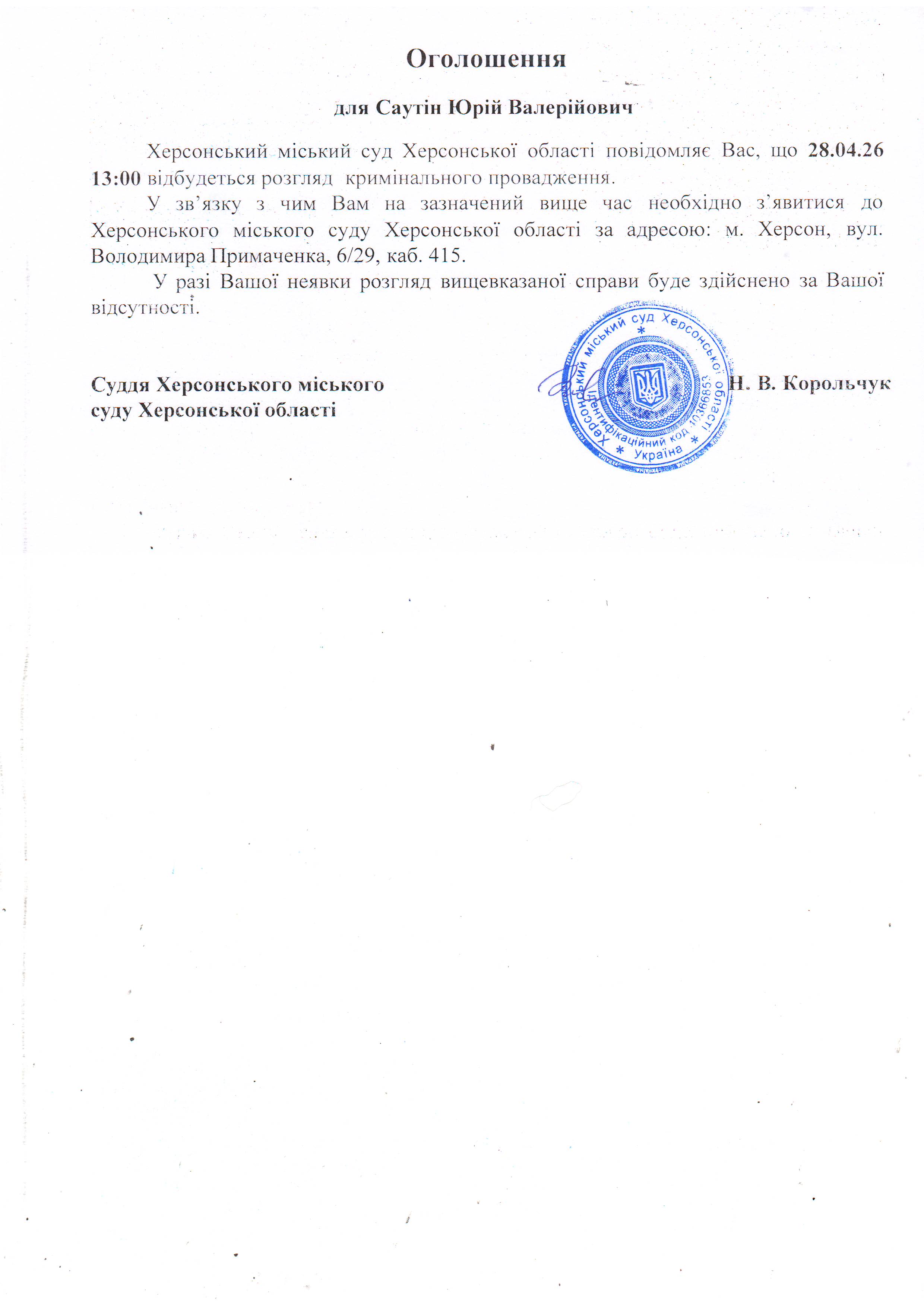 ОГОЛОШЕННЯ ПРО ВИКЛИК ДО СУДУ