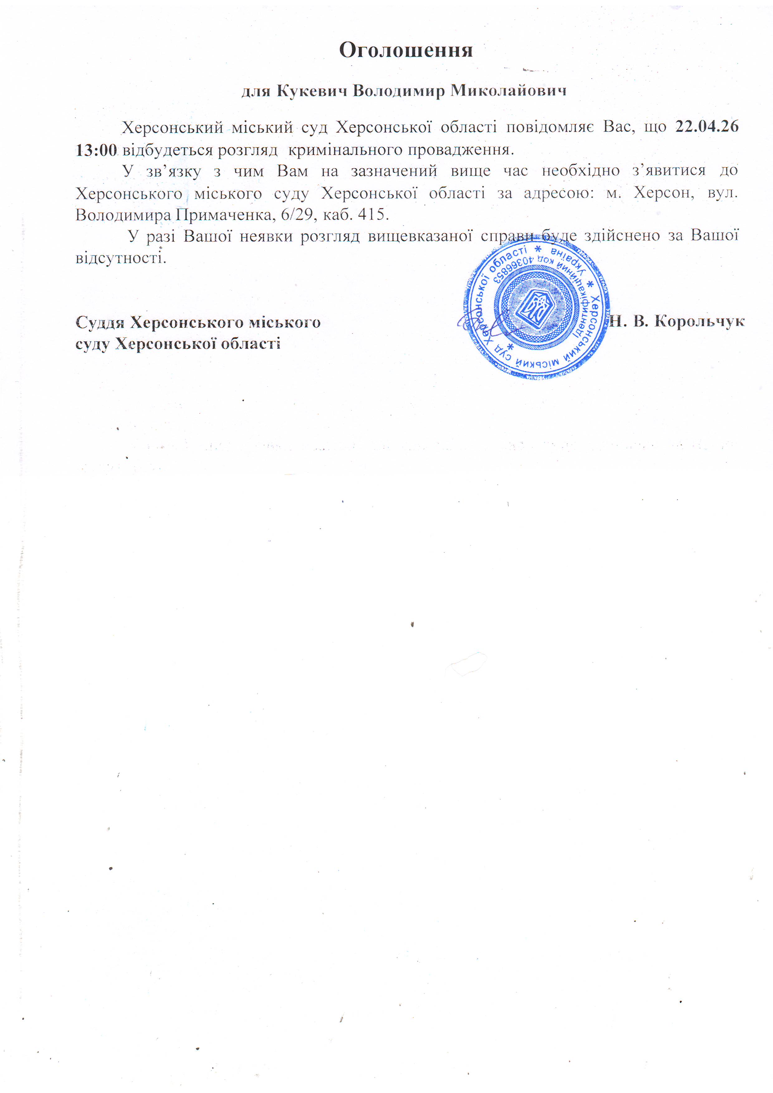 ОГОЛОШЕННЯ ПРО ВИКЛИК ДО СУДУ