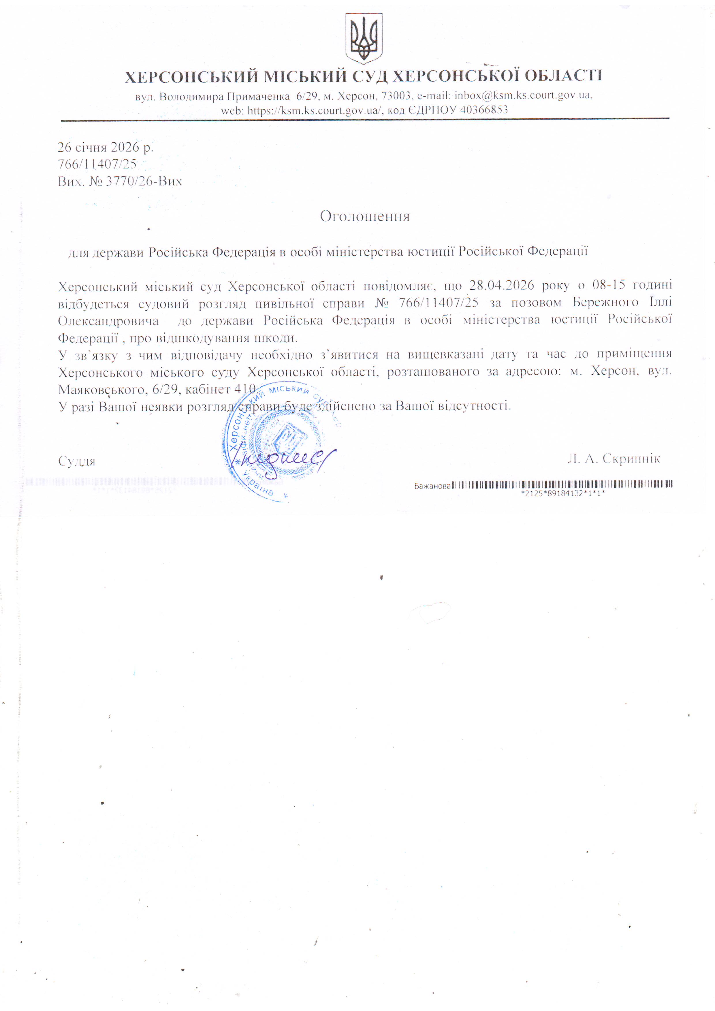 ОГОЛОШЕННЯ ПРО ВИКЛИК ДО СУДУ