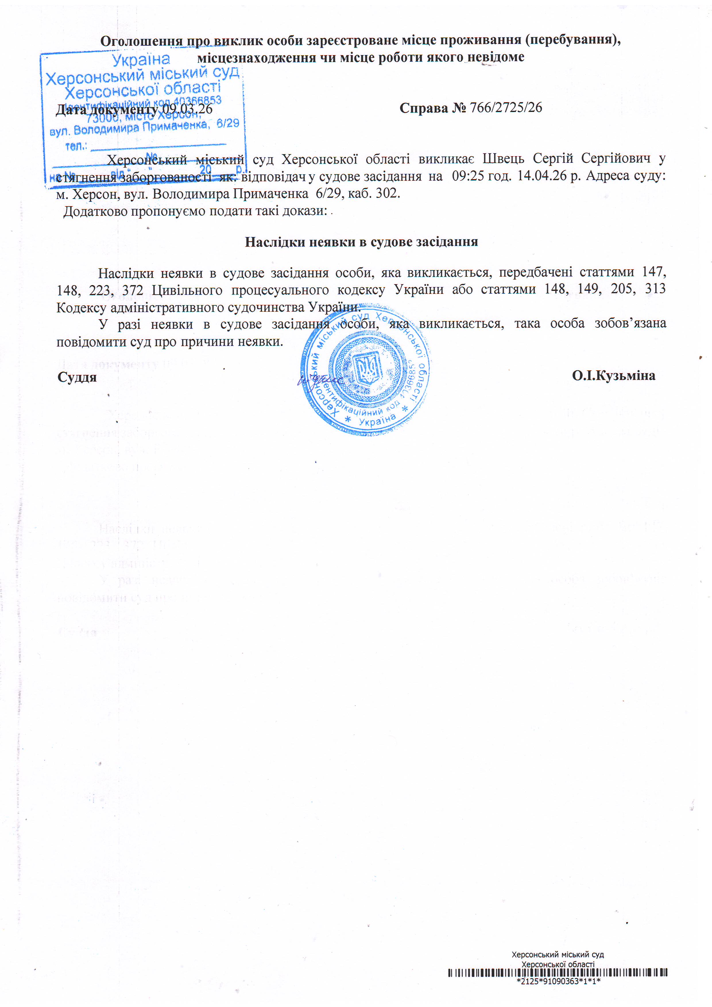 ОГОЛОШЕННЯ ПРО ВИКЛИК ДО СУДУ