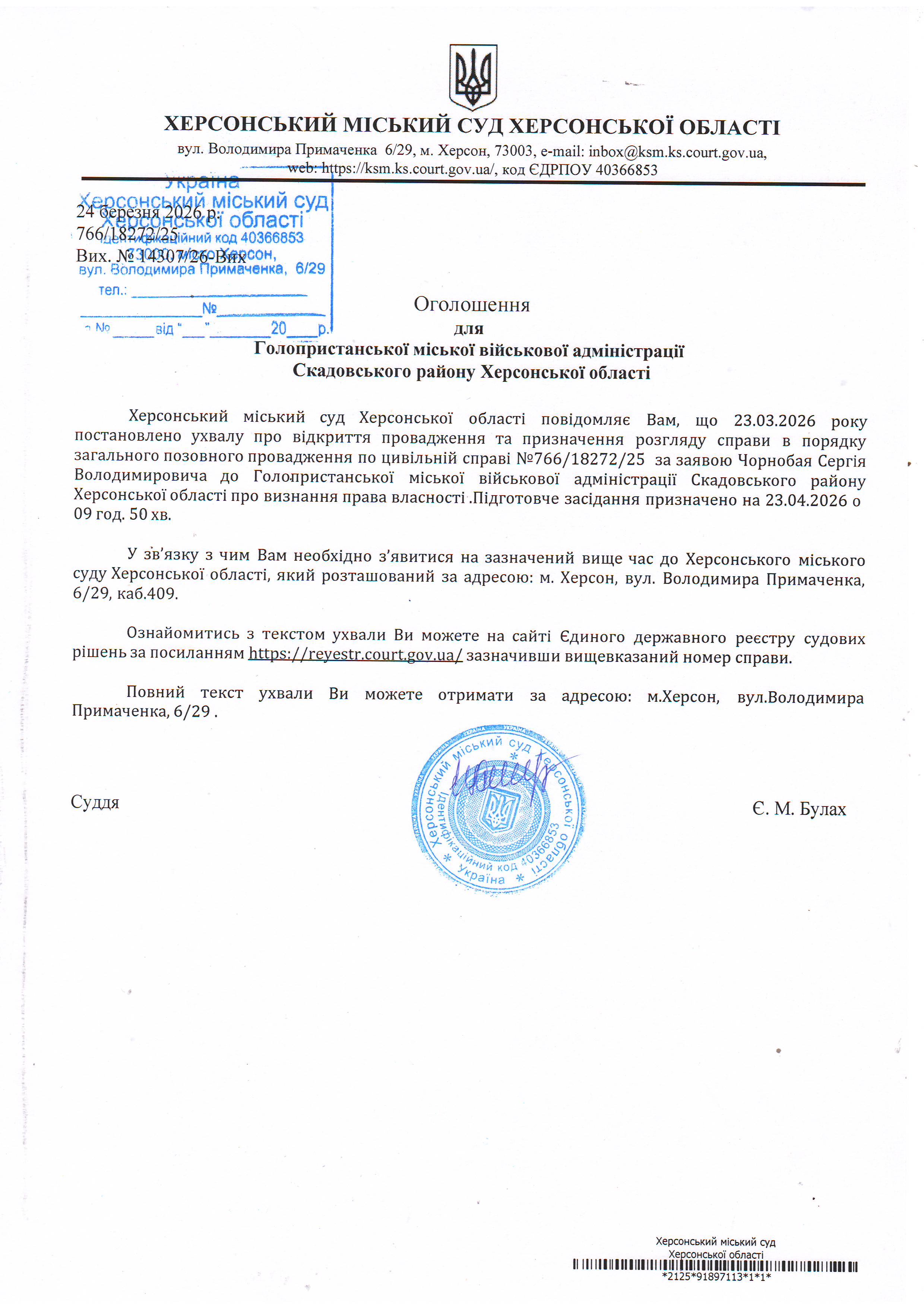 Оголошення для Голопристанської міської військової адміністрації Скадовського району Херсонської області