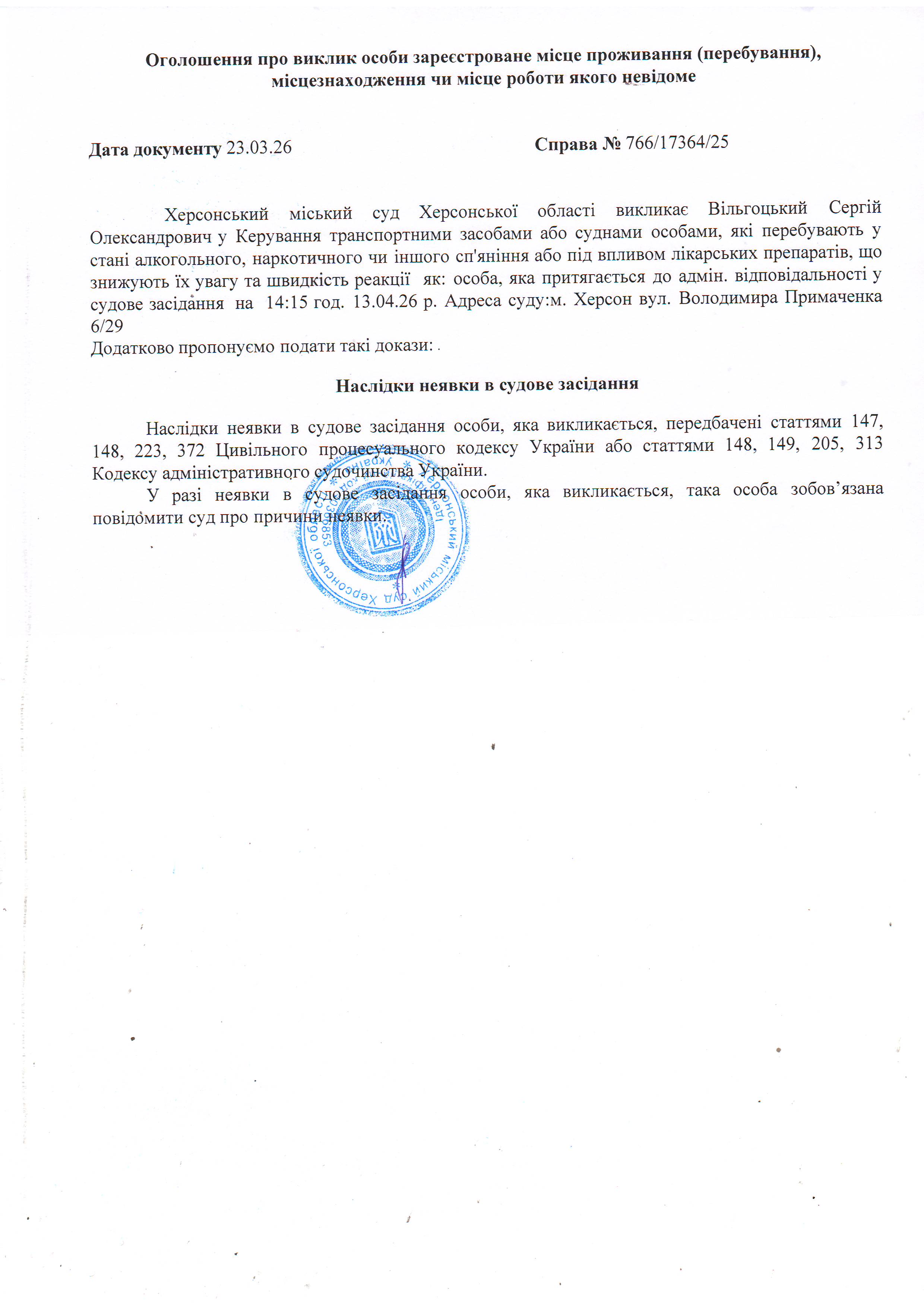 ОГОЛОШЕННЯ ПРО ВИКЛИК ДО СУДУ