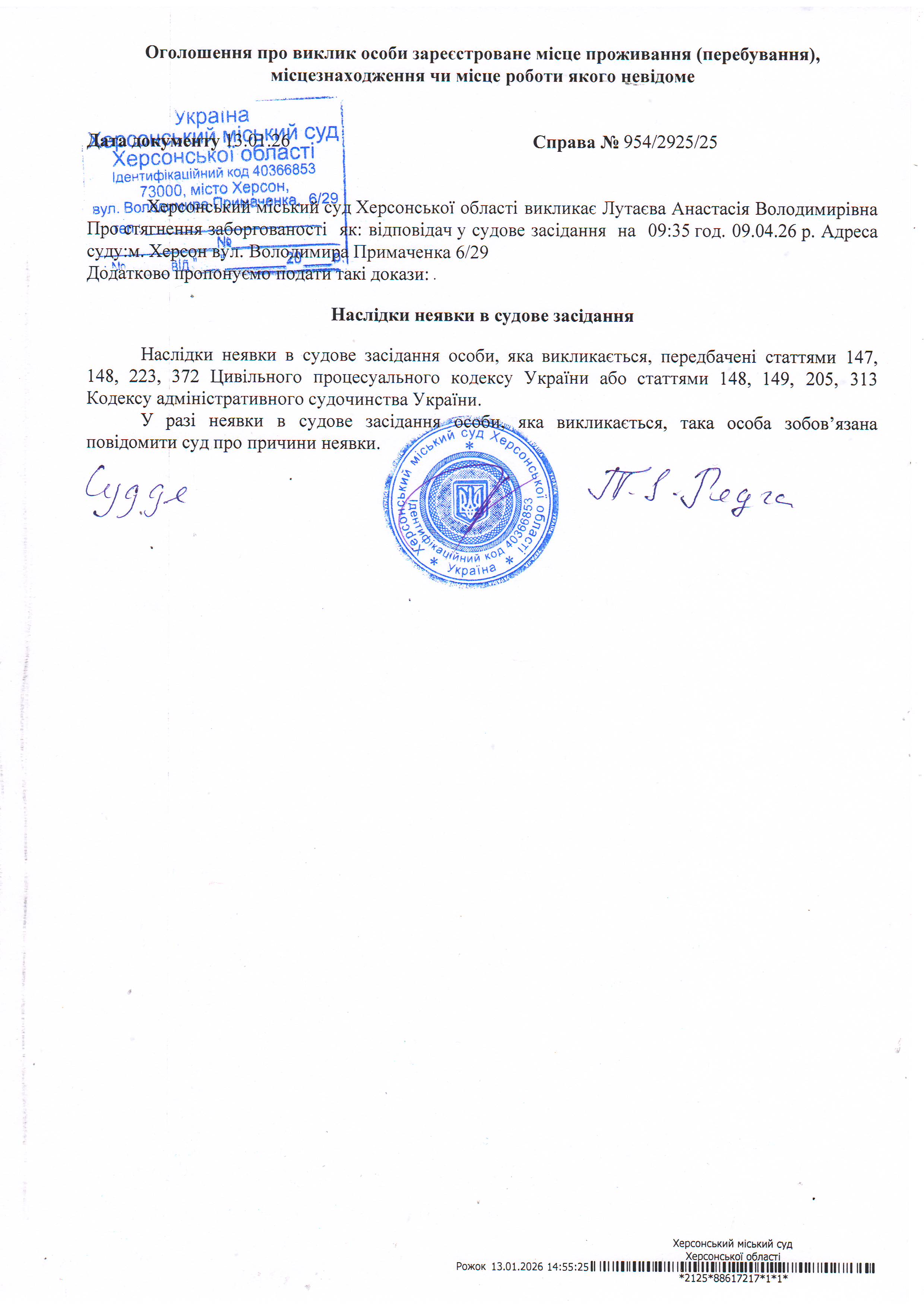 Оголошення для Лутаєвої Анастасії Володимирівни