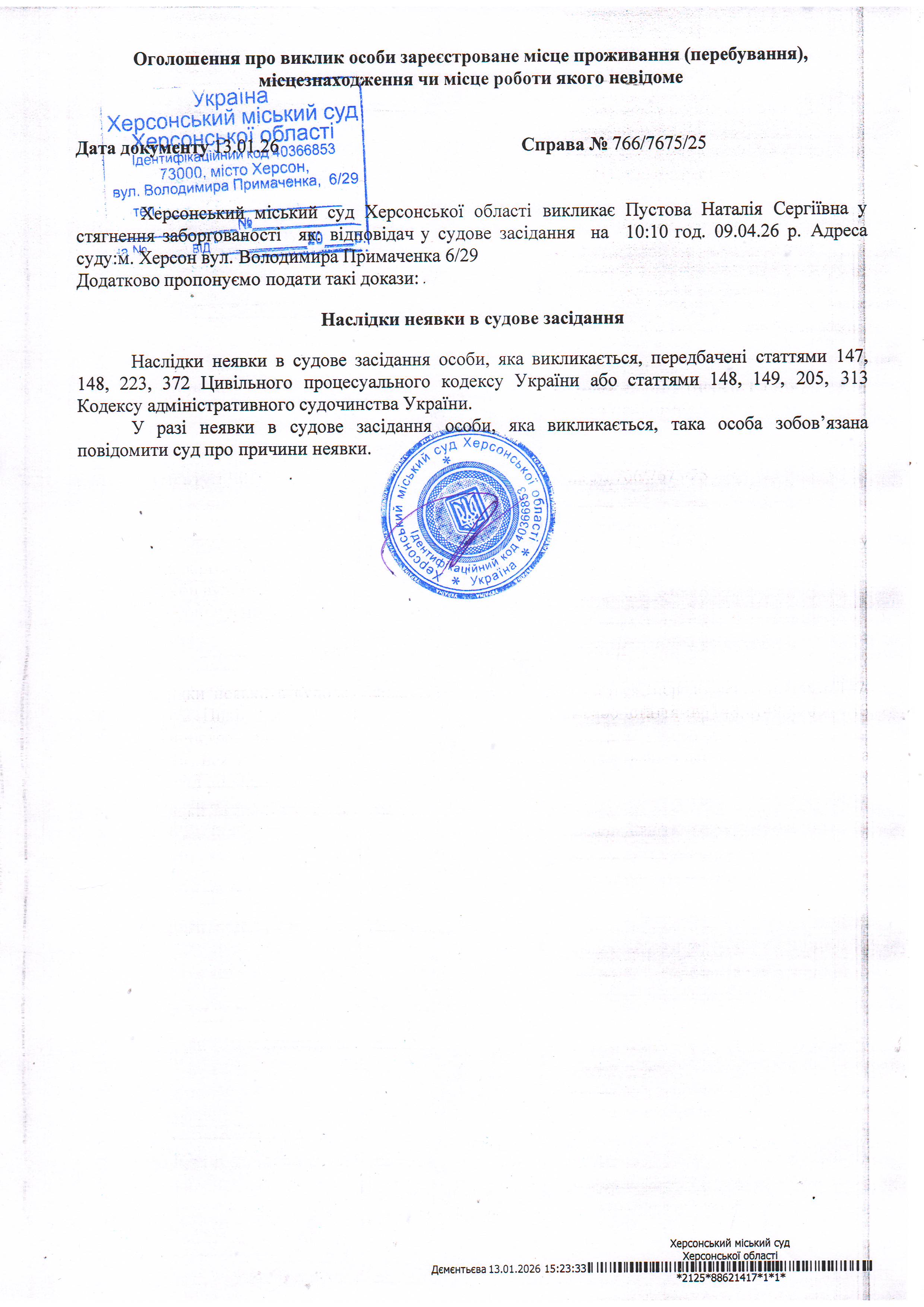 ОГОЛОШЕННЯ ПРО ВИКЛИК ДО СУДУ