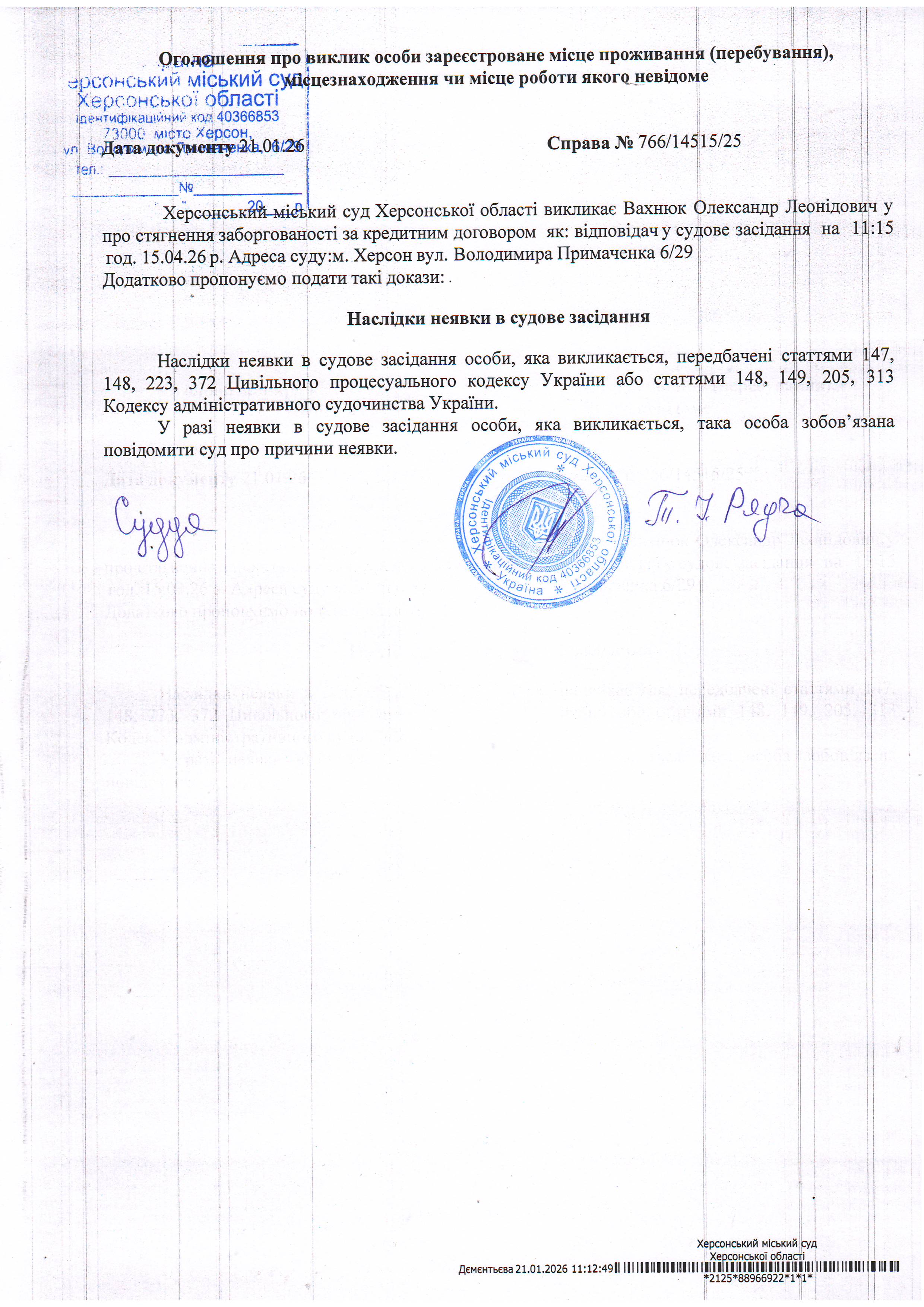 ОГОЛОШЕННЯ ПРО ВИКЛИК ДО СУДУ
