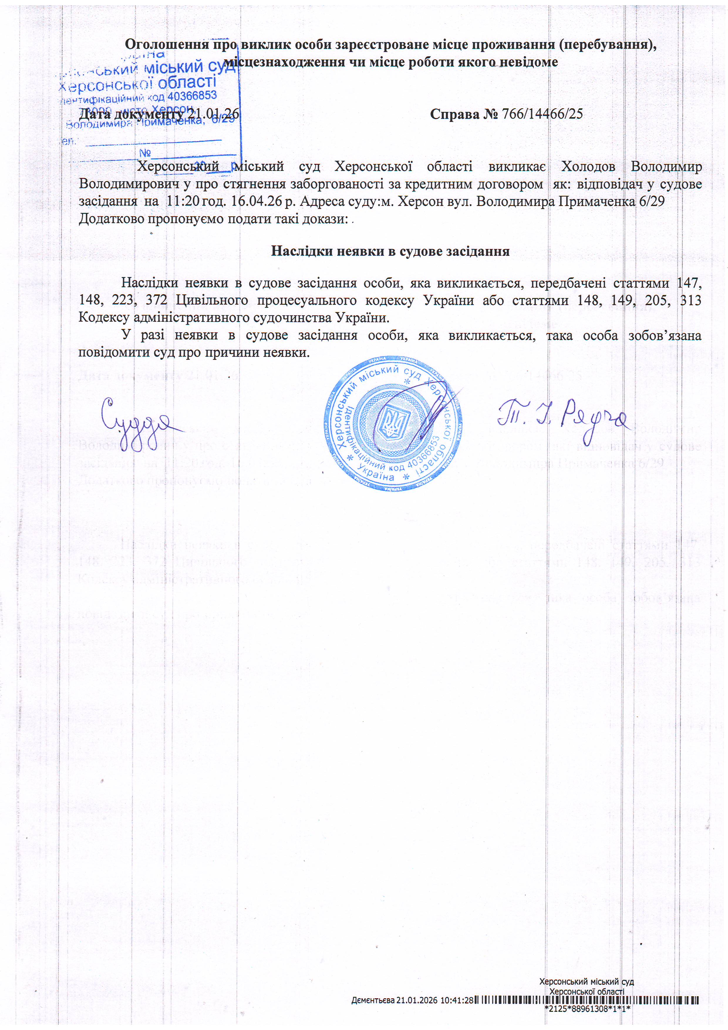 ОГОЛОШЕННЯ ПРО ВИКЛИК ДО СУДУ