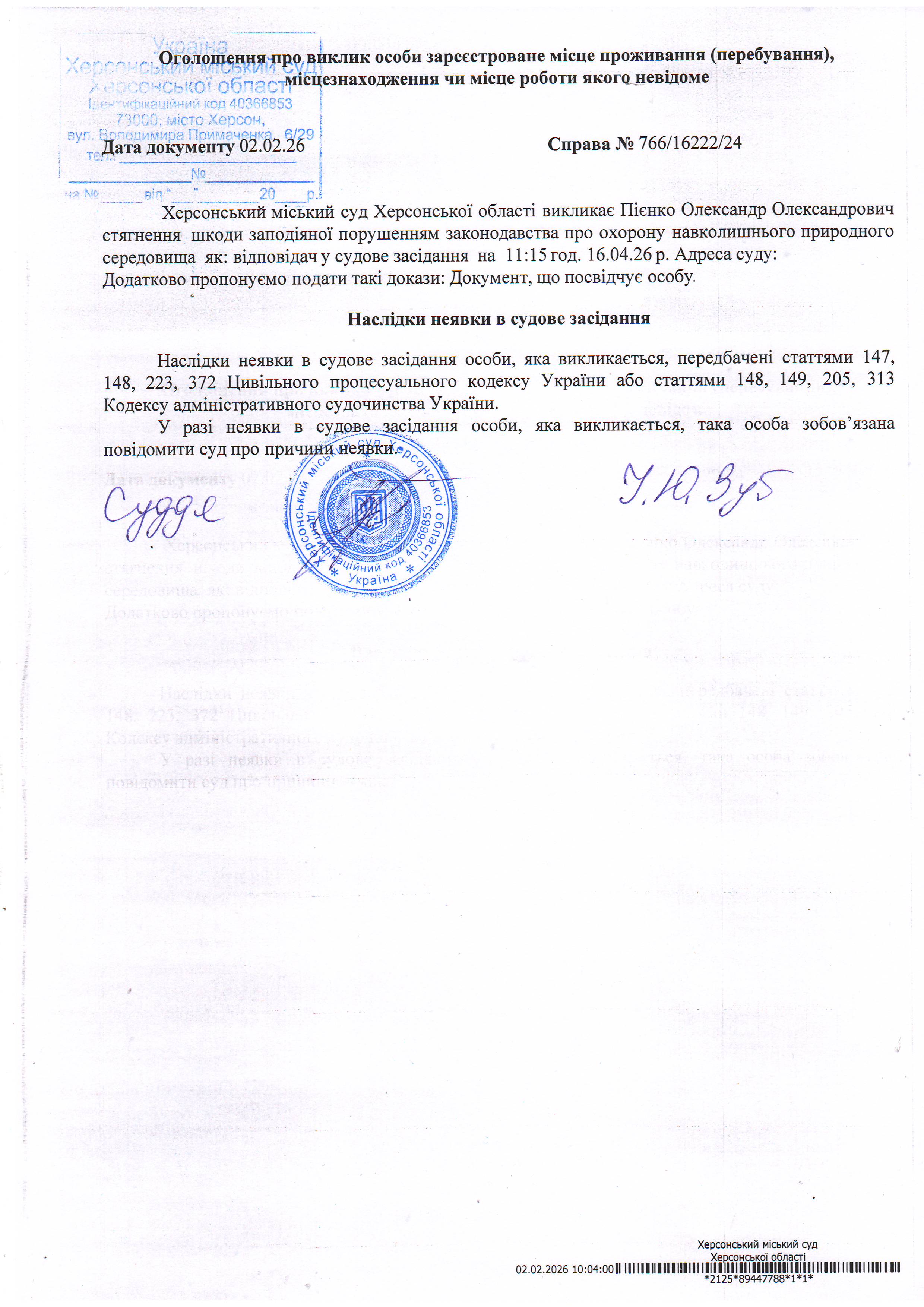 ОГОЛОШЕННЯ ПРО ВИКЛИК ДО СУДУ