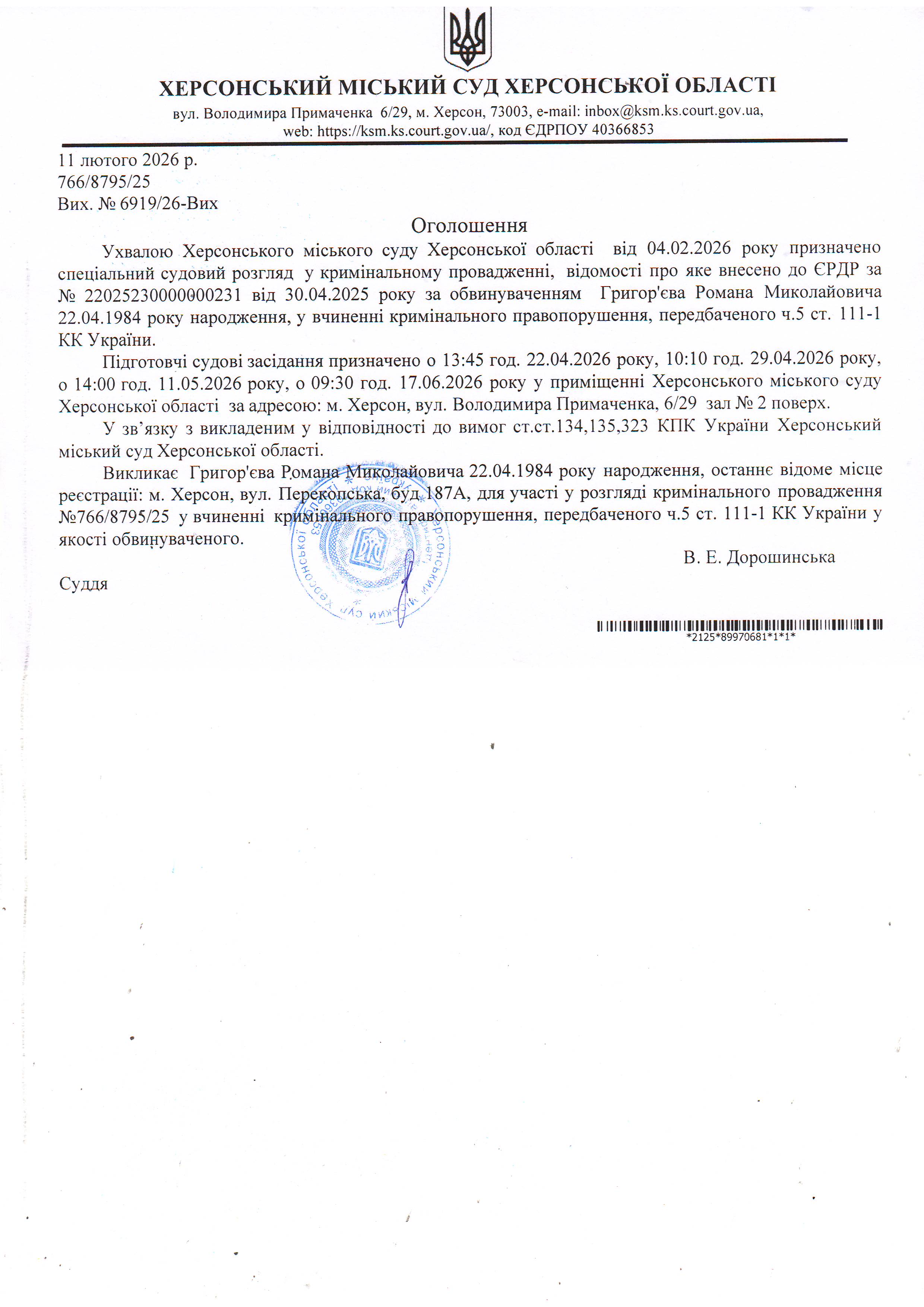 Оголошення про виклик особи в суд та повідомлення про судове рішення