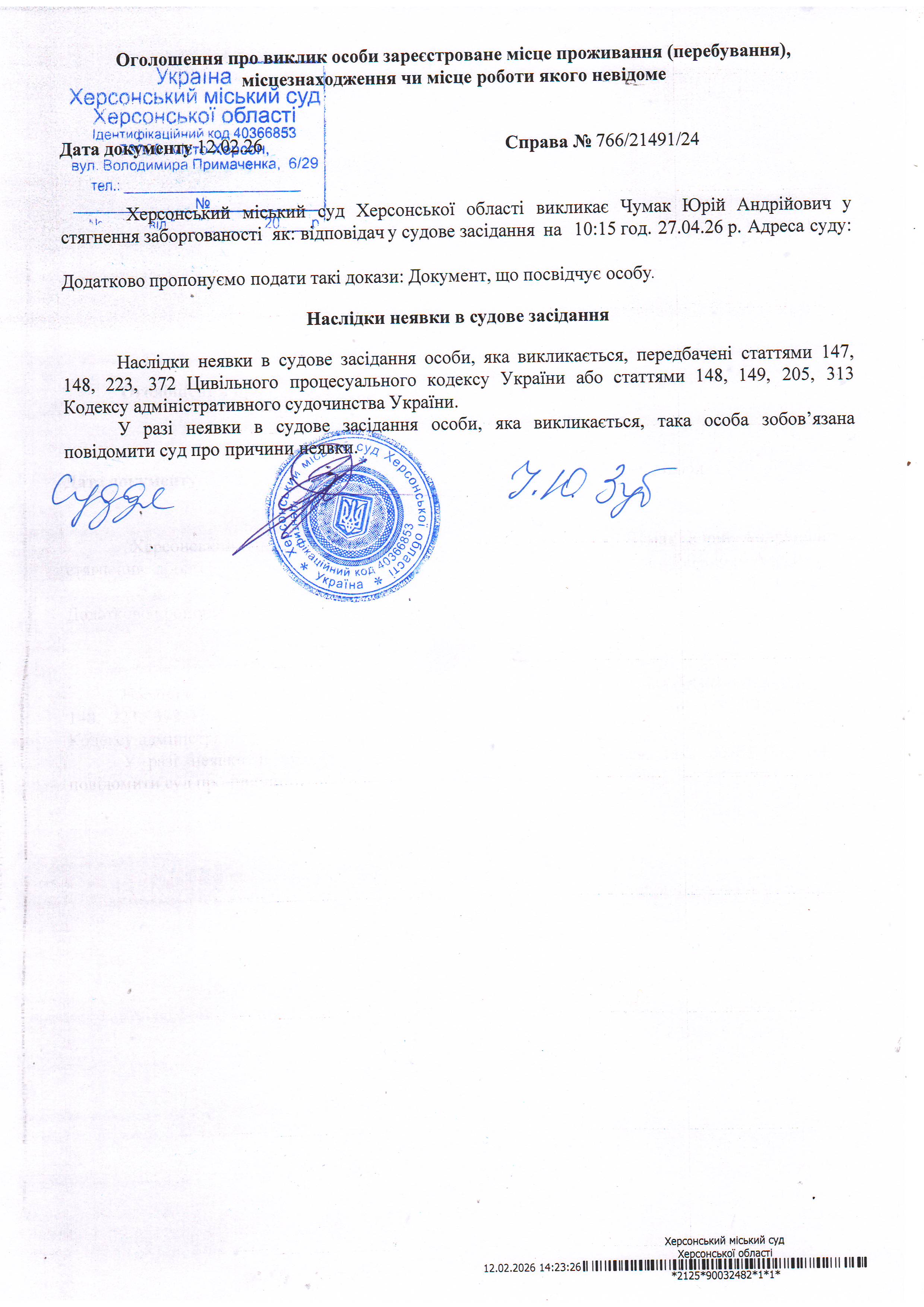 ОГОЛОШЕННЯ ПРО ВИКЛИК ДО СУДУ