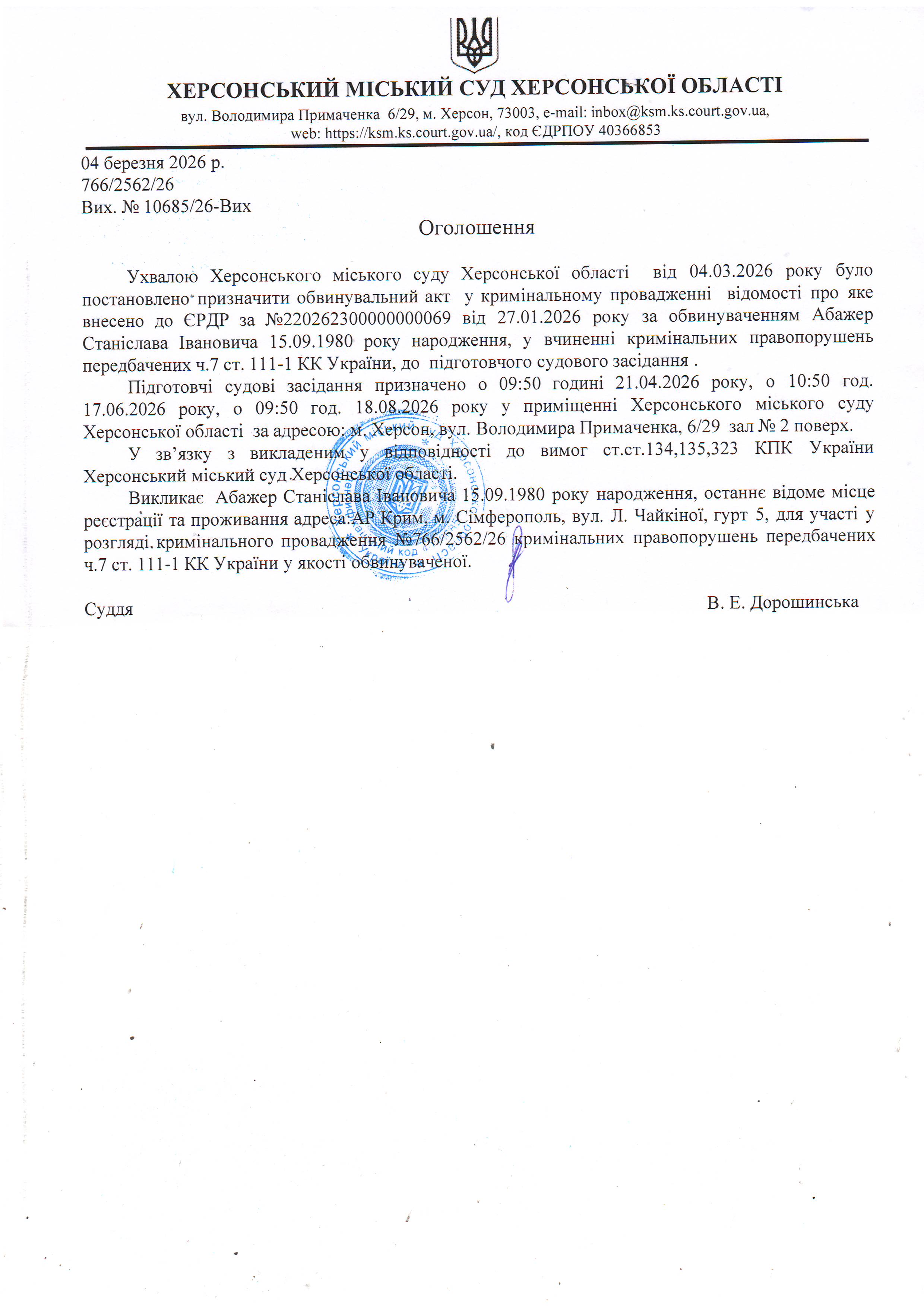ОГОЛОШЕННЯ ПРО ВИКЛИК ДО СУДУ