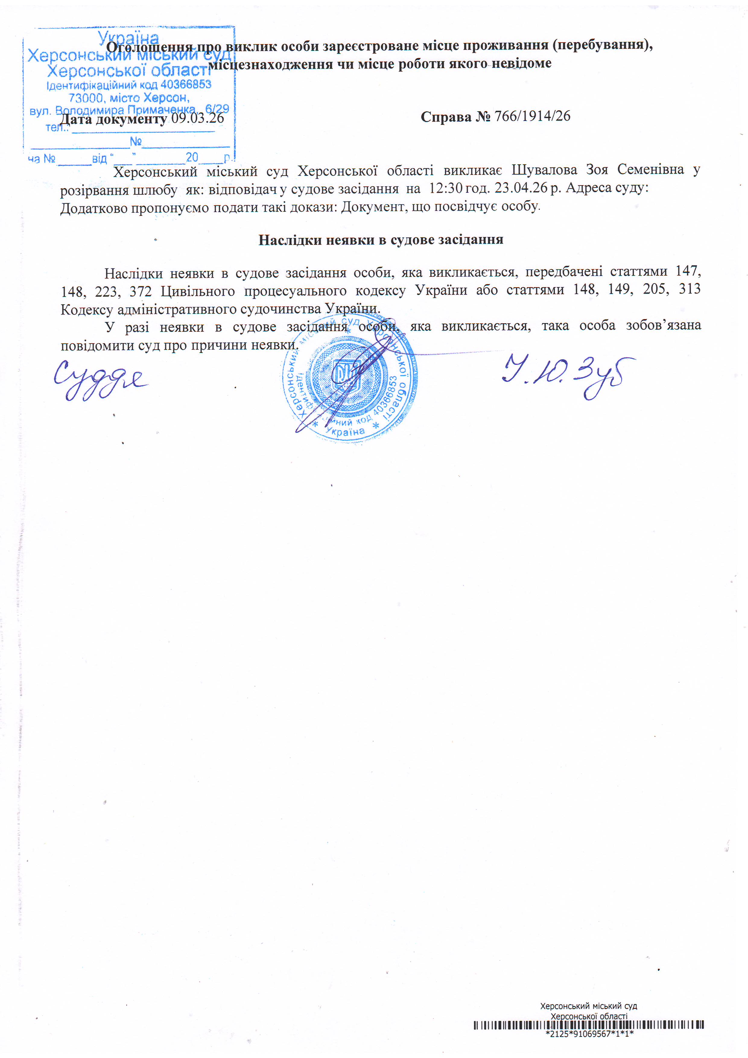 ОГОЛОШЕННЯ ПРО ВИКЛИК ДО СУДУ