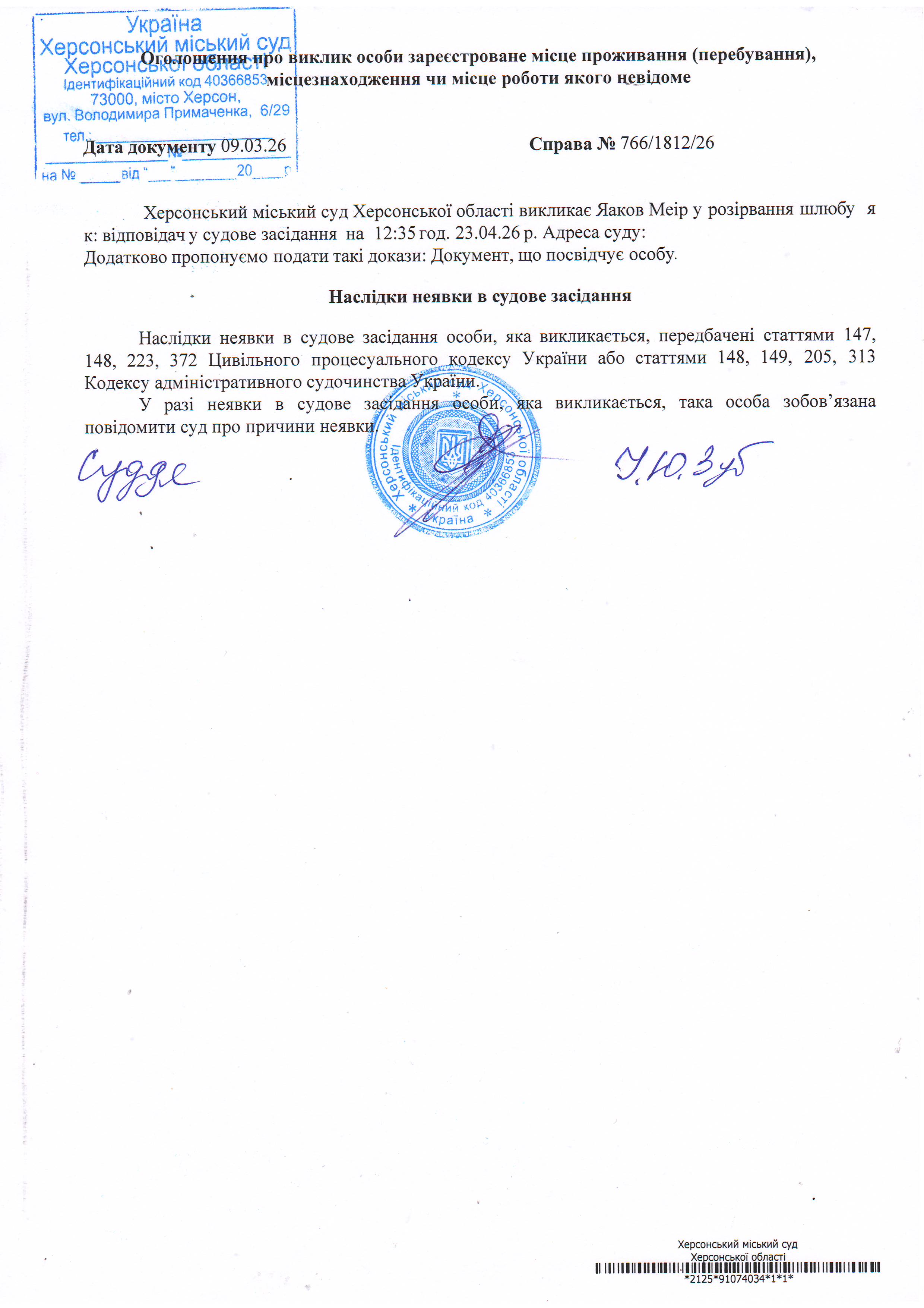 ОГОЛОШЕННЯ ПРО ВИКЛИК ДО СУДУ