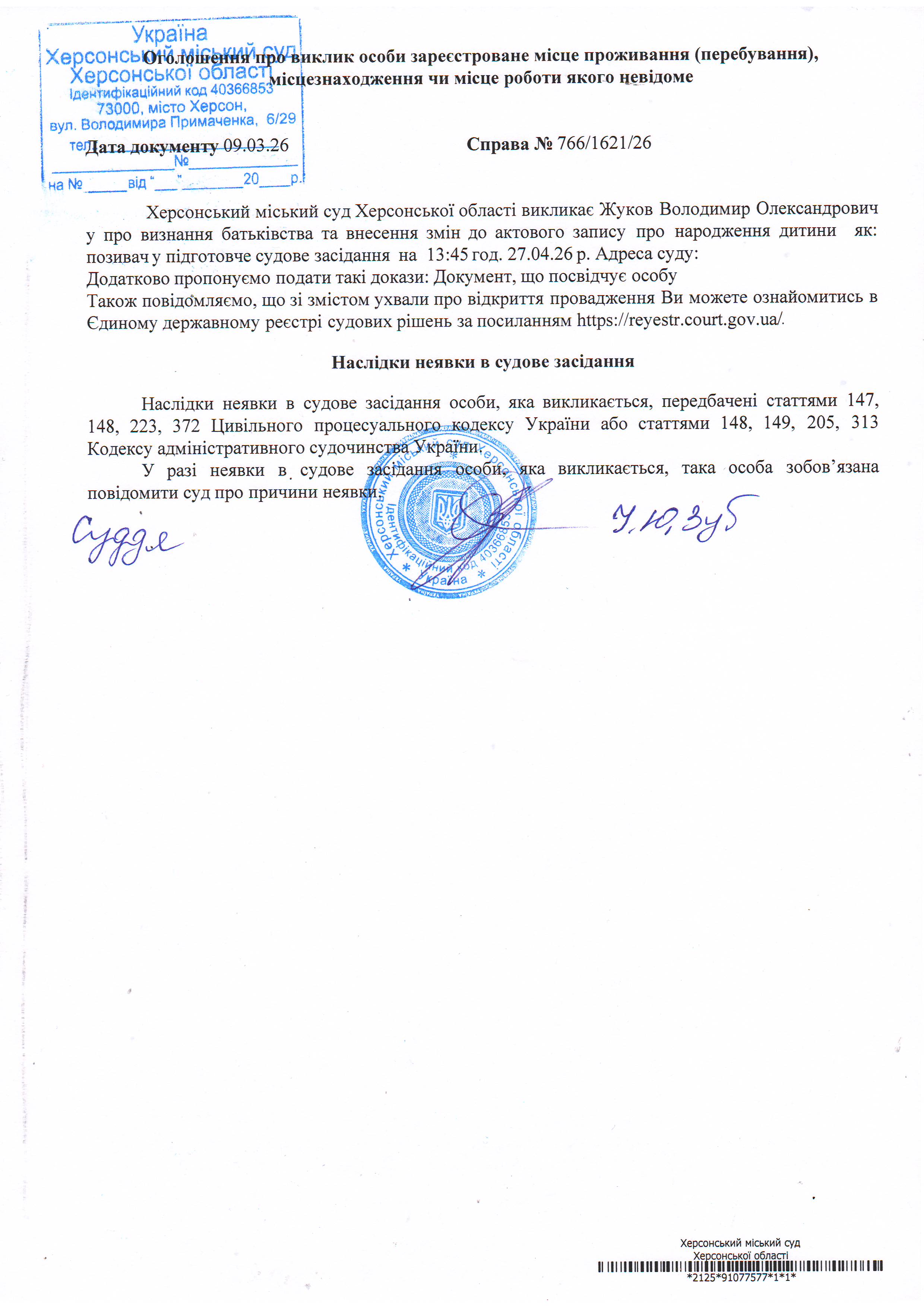 ОГОЛОШЕННЯ ПРО ВИКЛИК ДО СУДУ