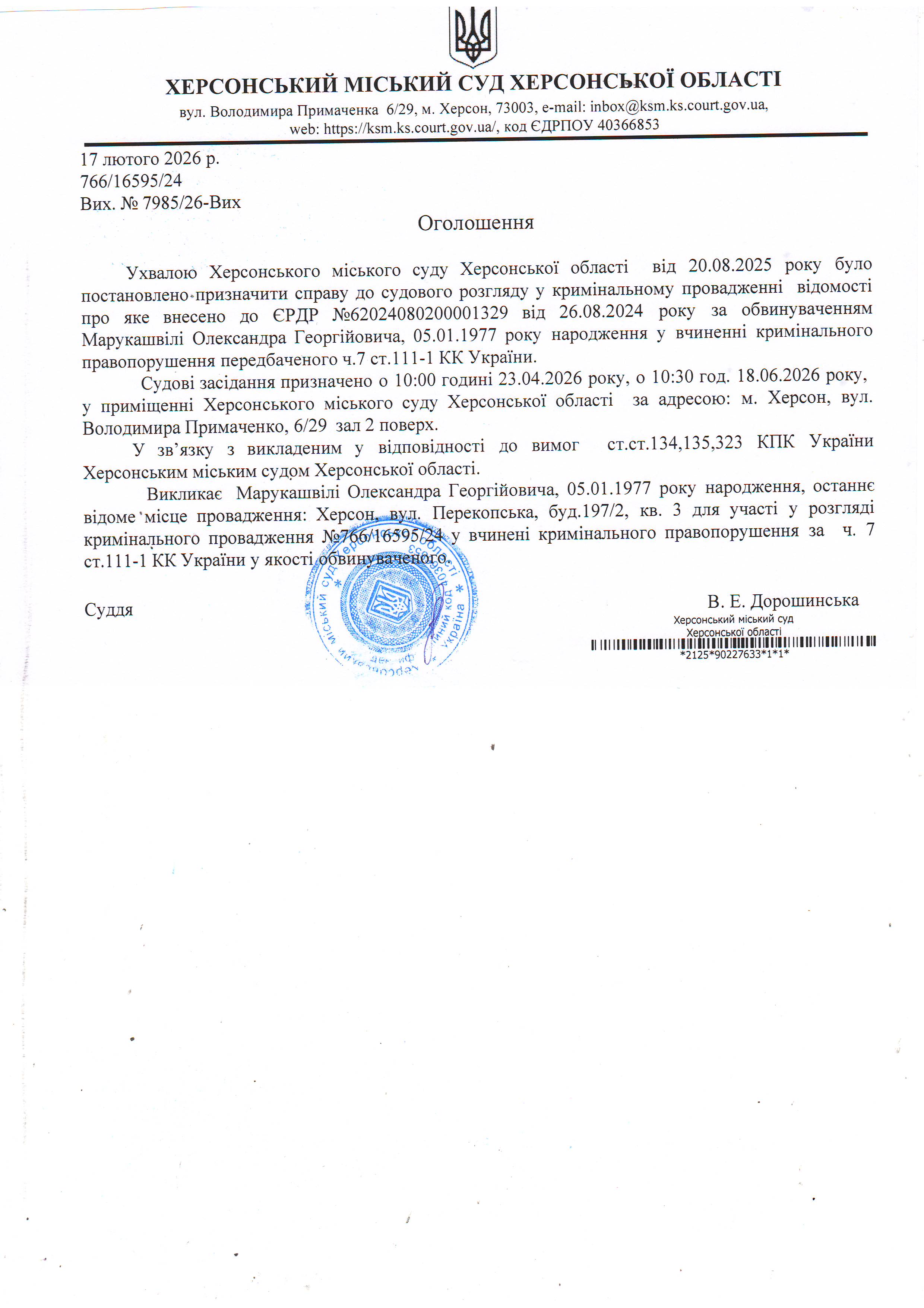 Оголошення для Марукашвілі Олександра Георгійовича