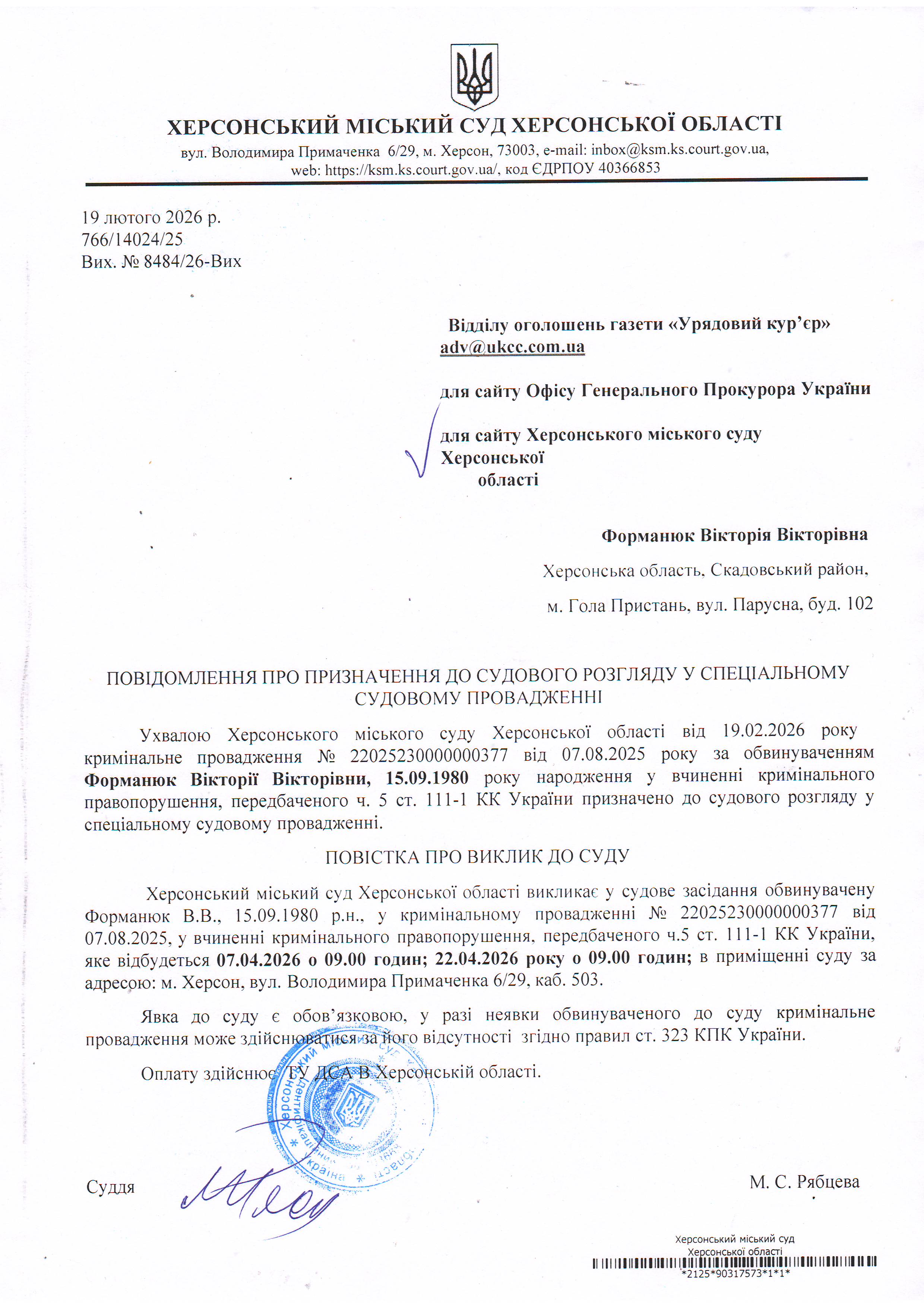 Оголошення про виклик особи в суд та повідомлення про судове рішення
