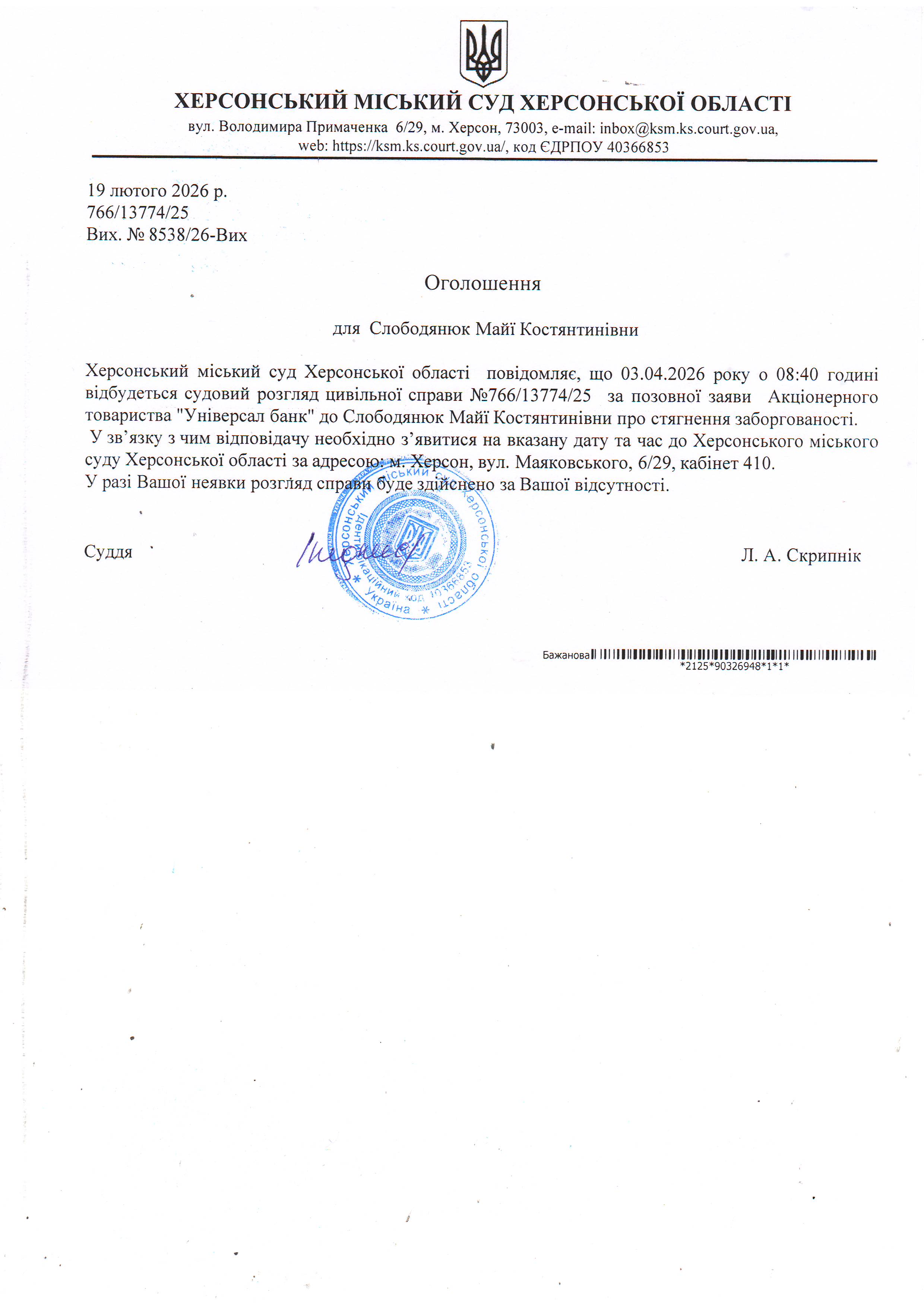 ОГОЛОШЕННЯ ПРО ВИКЛИК ДО СУДУ