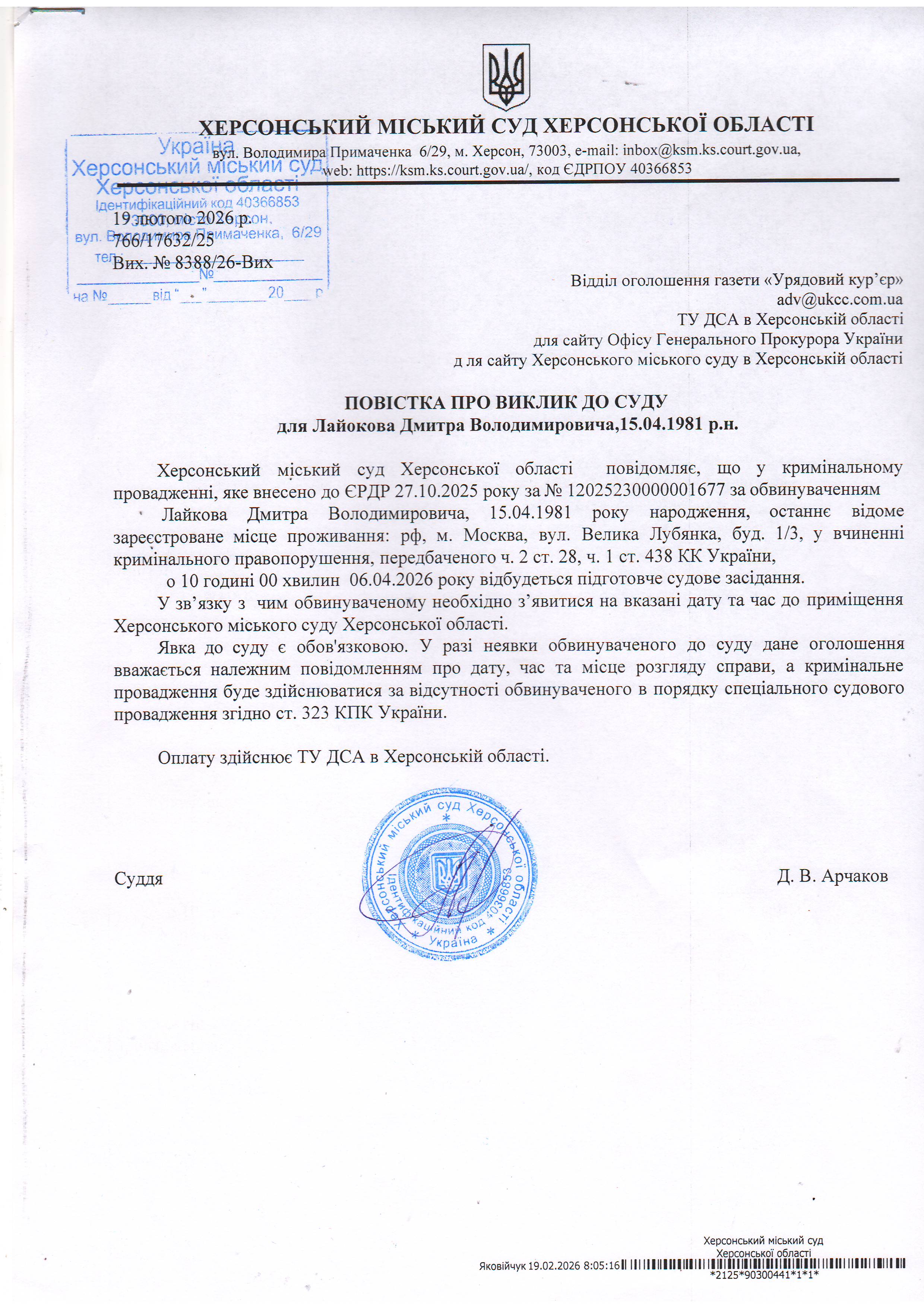 ОГОЛОШЕННЯ ПРО ВИКЛИК ДО СУДУ