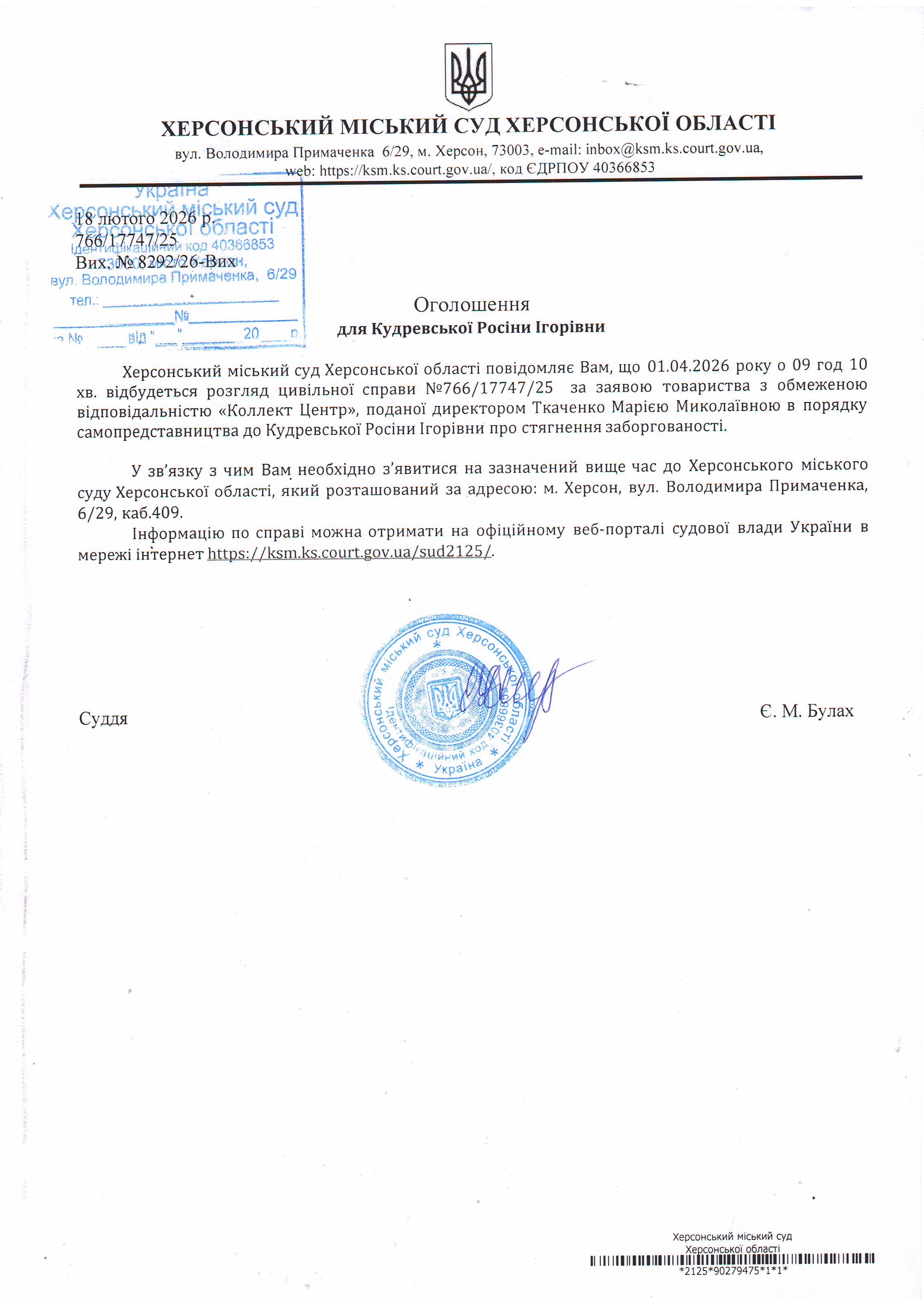 Оголошення для Кудревської Росіни Ігорівни