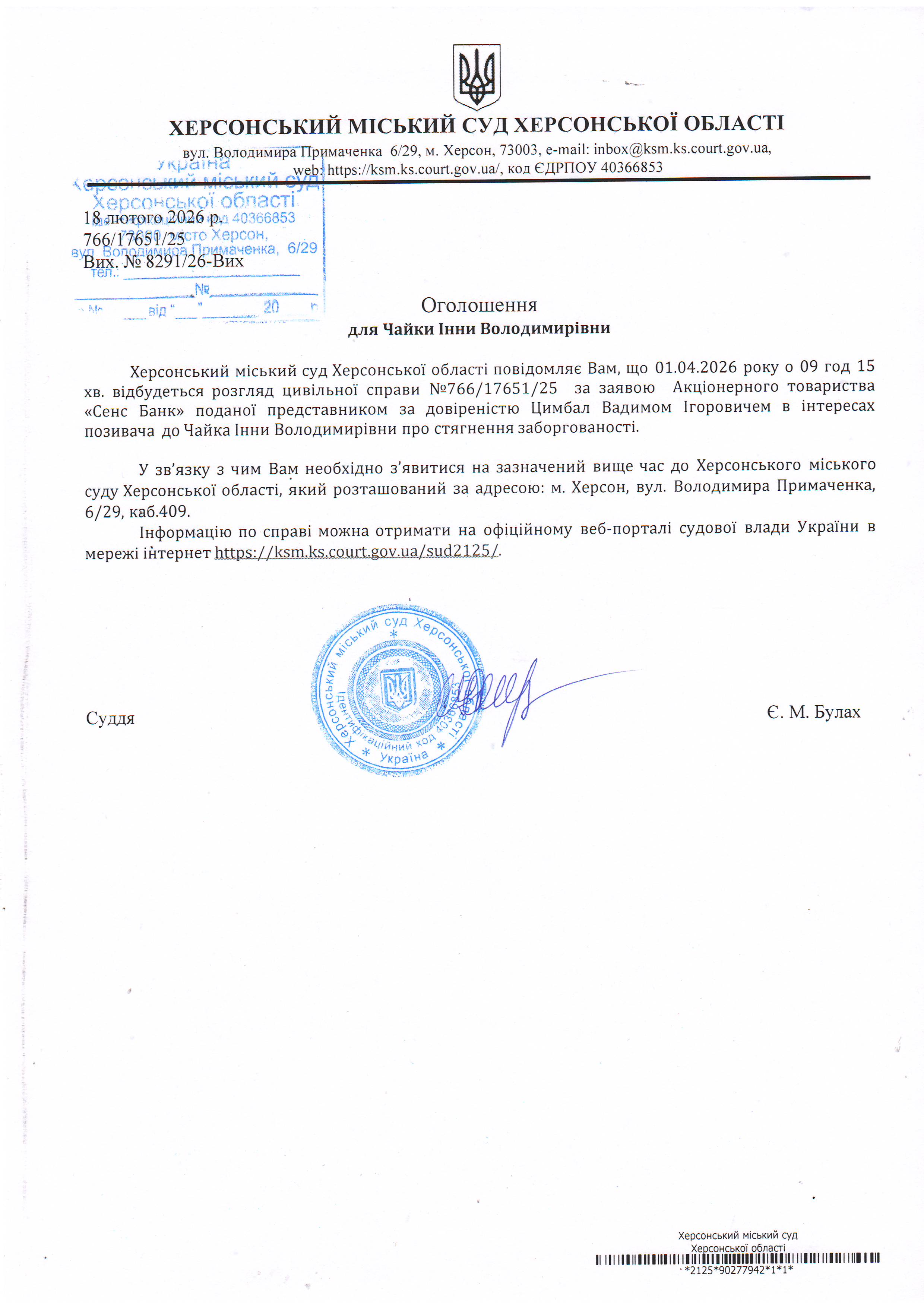 ОГОЛОШЕННЯ ПРО ВИКЛИК ДО СУДУ