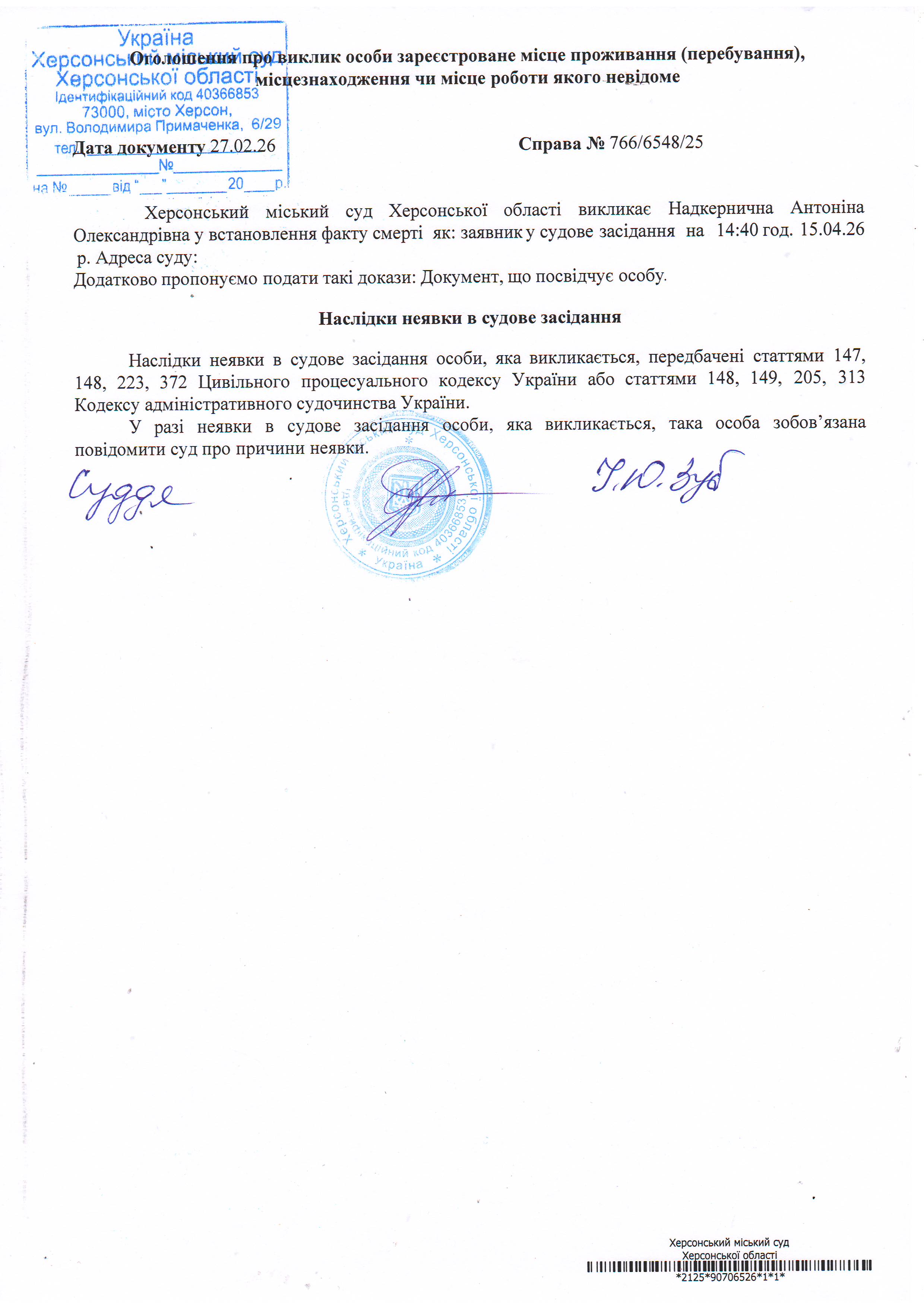 ОГОЛОШЕННЯ ПРО ВИКЛИК ДО СУДУ