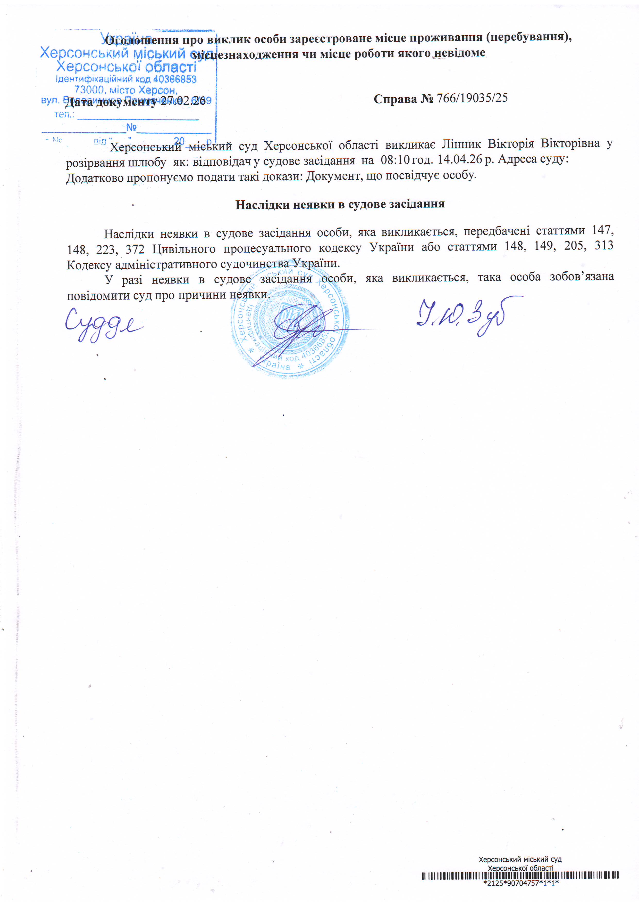 ОГОЛОШЕННЯ ПРО ВИКЛИК ДО СУДУ