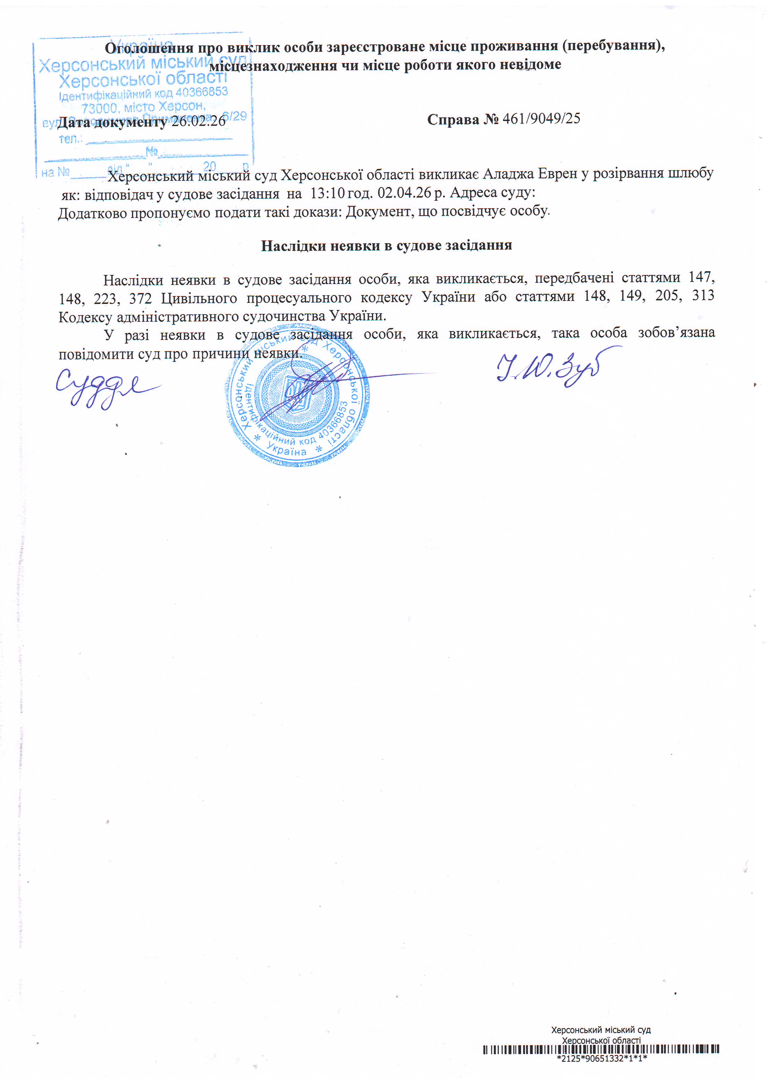 ОГОЛОШЕННЯ ПРО ВИКЛИК ДО СУДУ