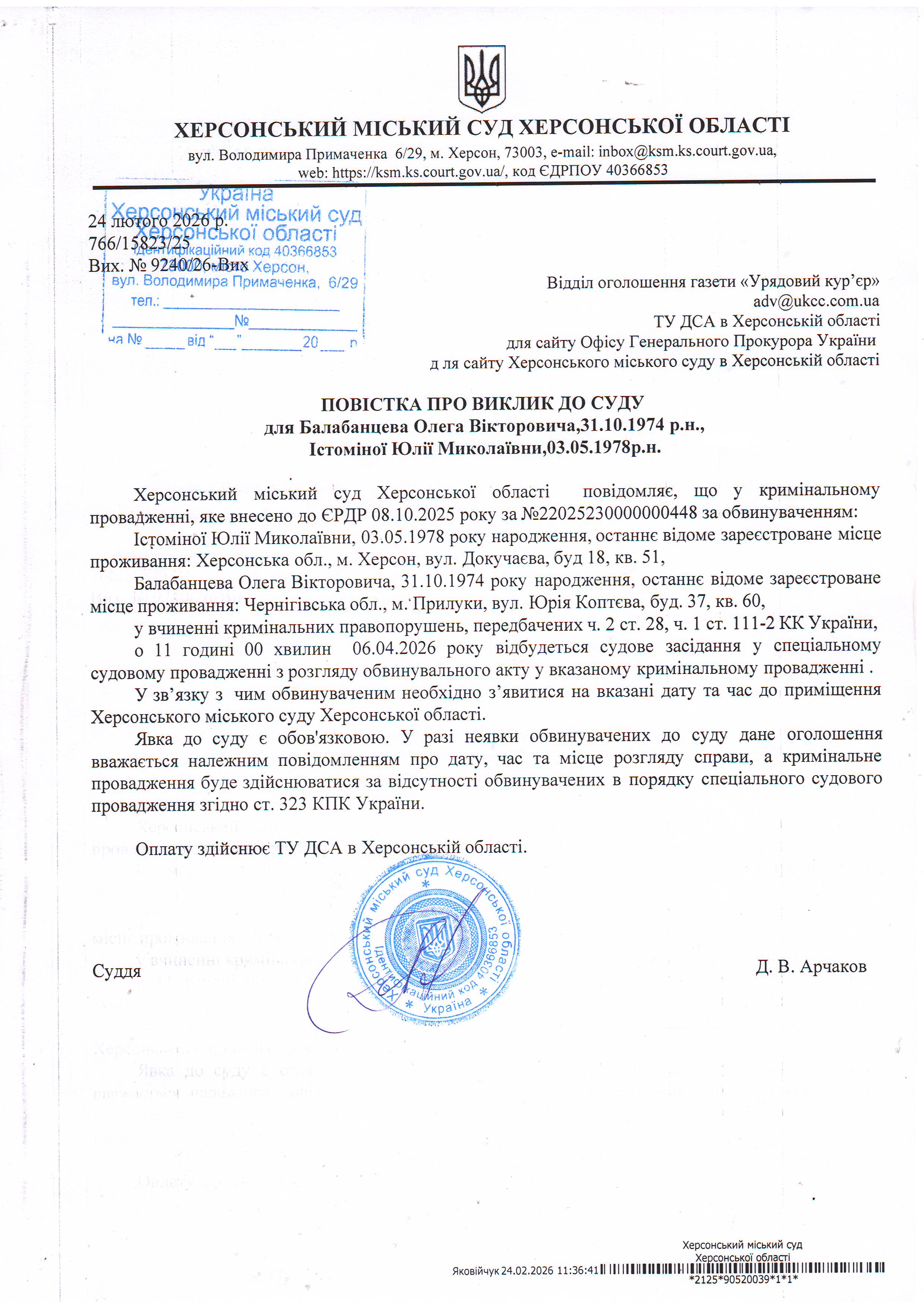 ОГОЛОШЕННЯ ПРО ВИКЛИК ДО СУДУ