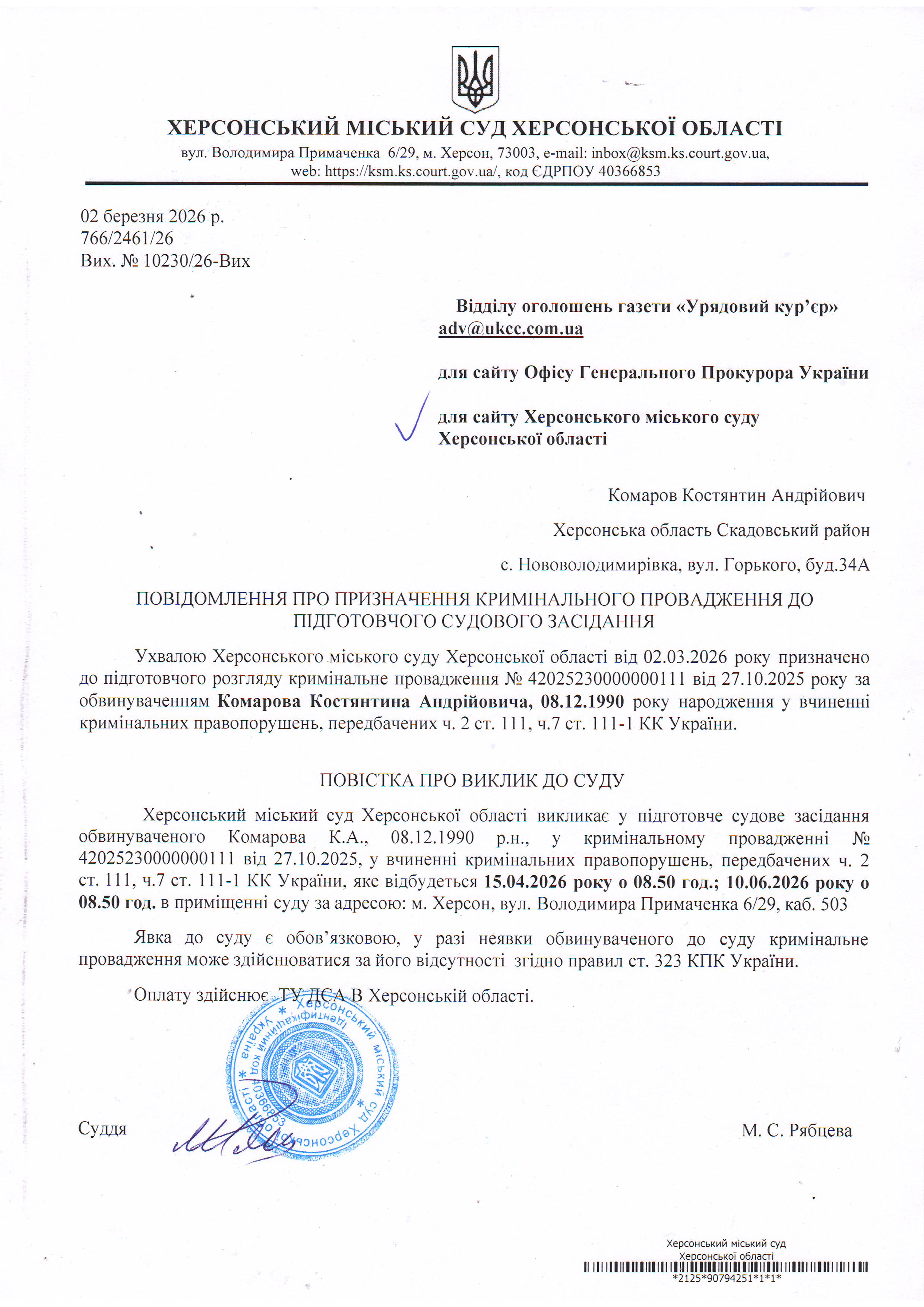ОГОЛОШЕННЯ ПРО ВИКЛИК ДО СУДУ