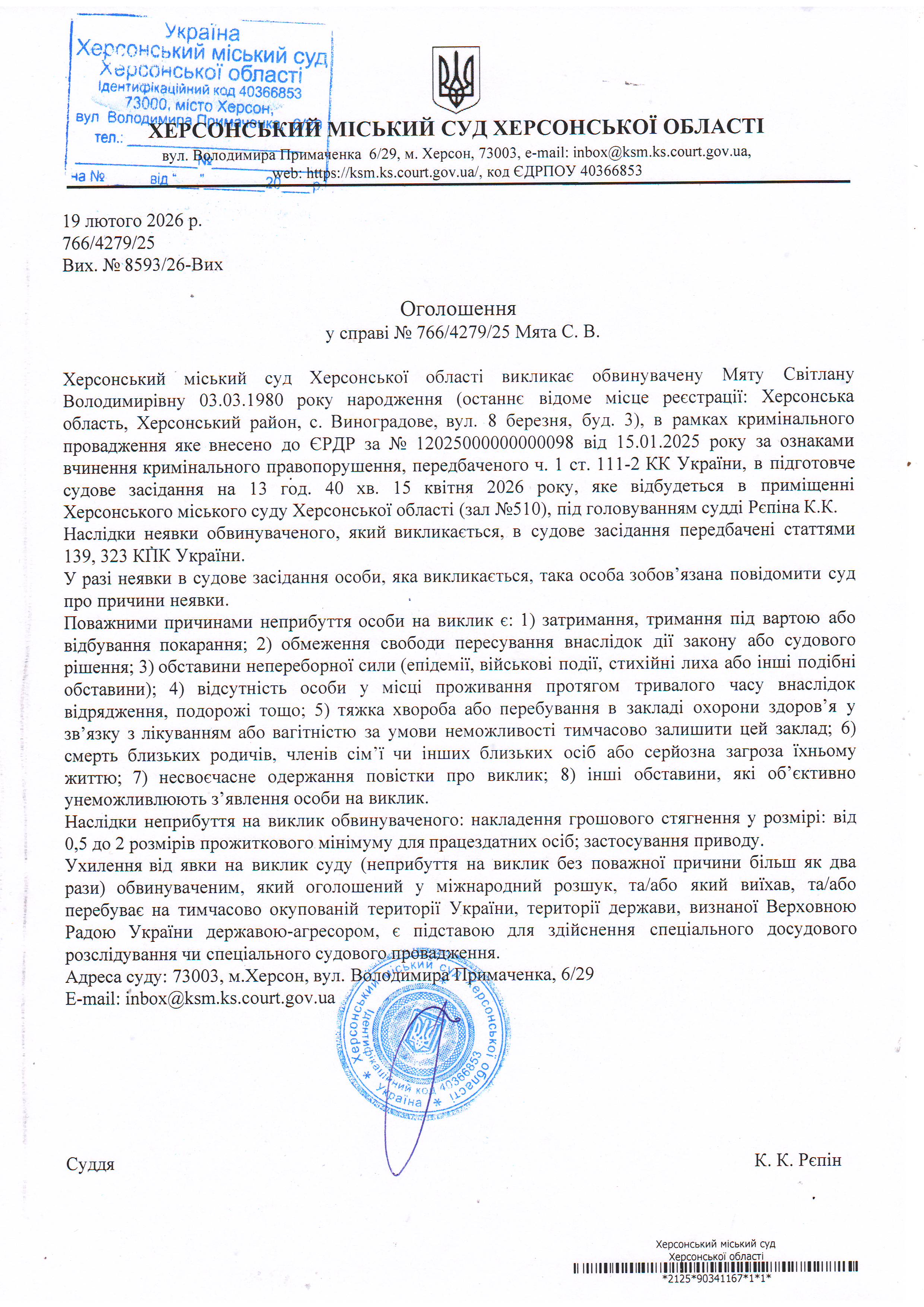 ОГОЛОШЕННЯ ПРО ВИКЛИК ДО СУДУ