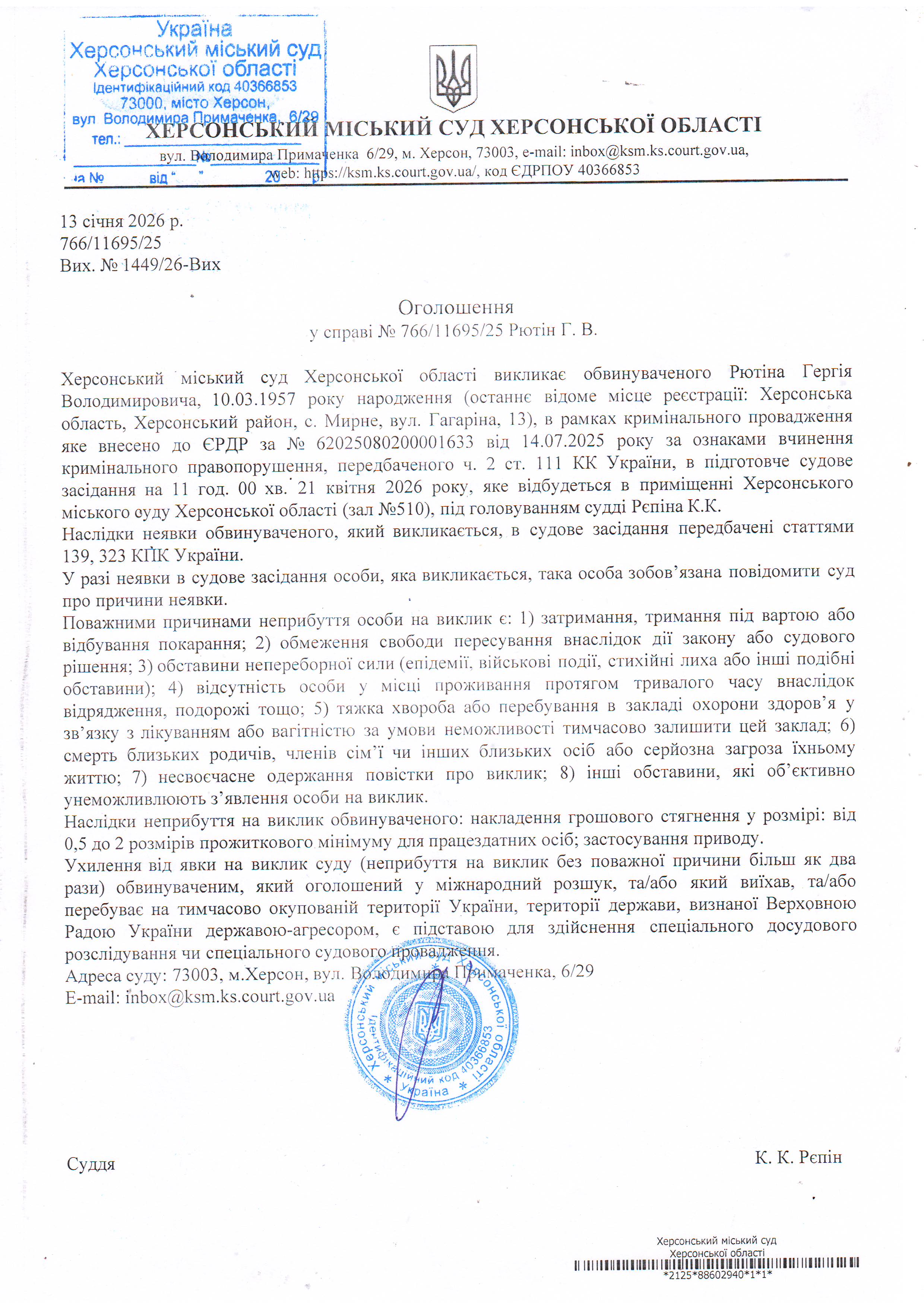 Оголошення про виклик особи в суд та повідомлення про судове рішення