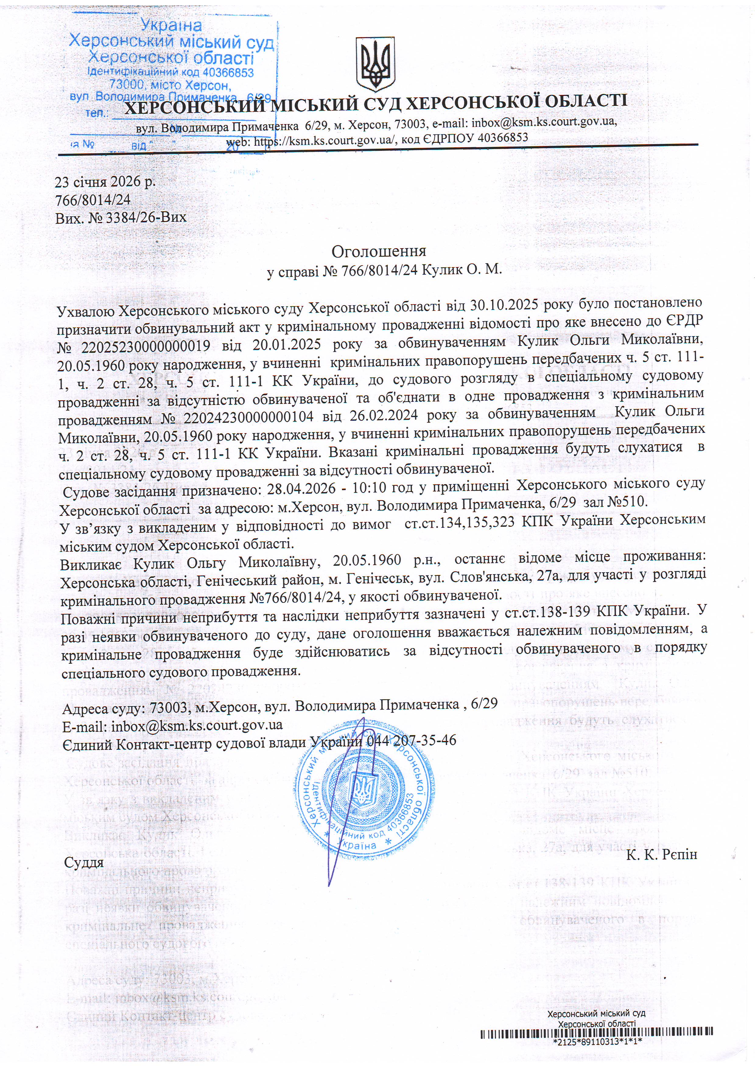 ОГОЛОШЕННЯ ПРО ВИКЛИК ДО СУДУ