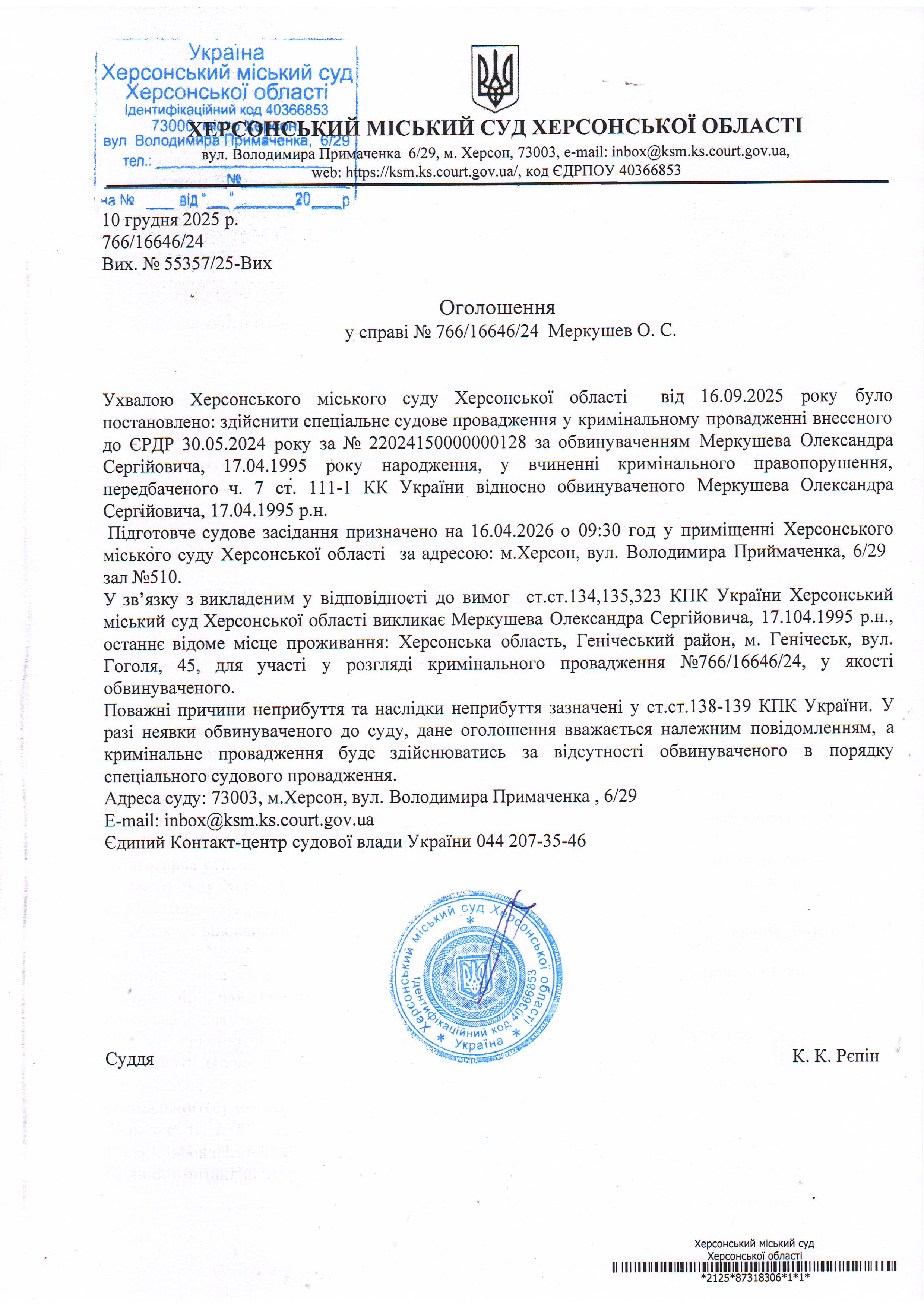 Оголошення для Меркушева Олександра Сергійовича