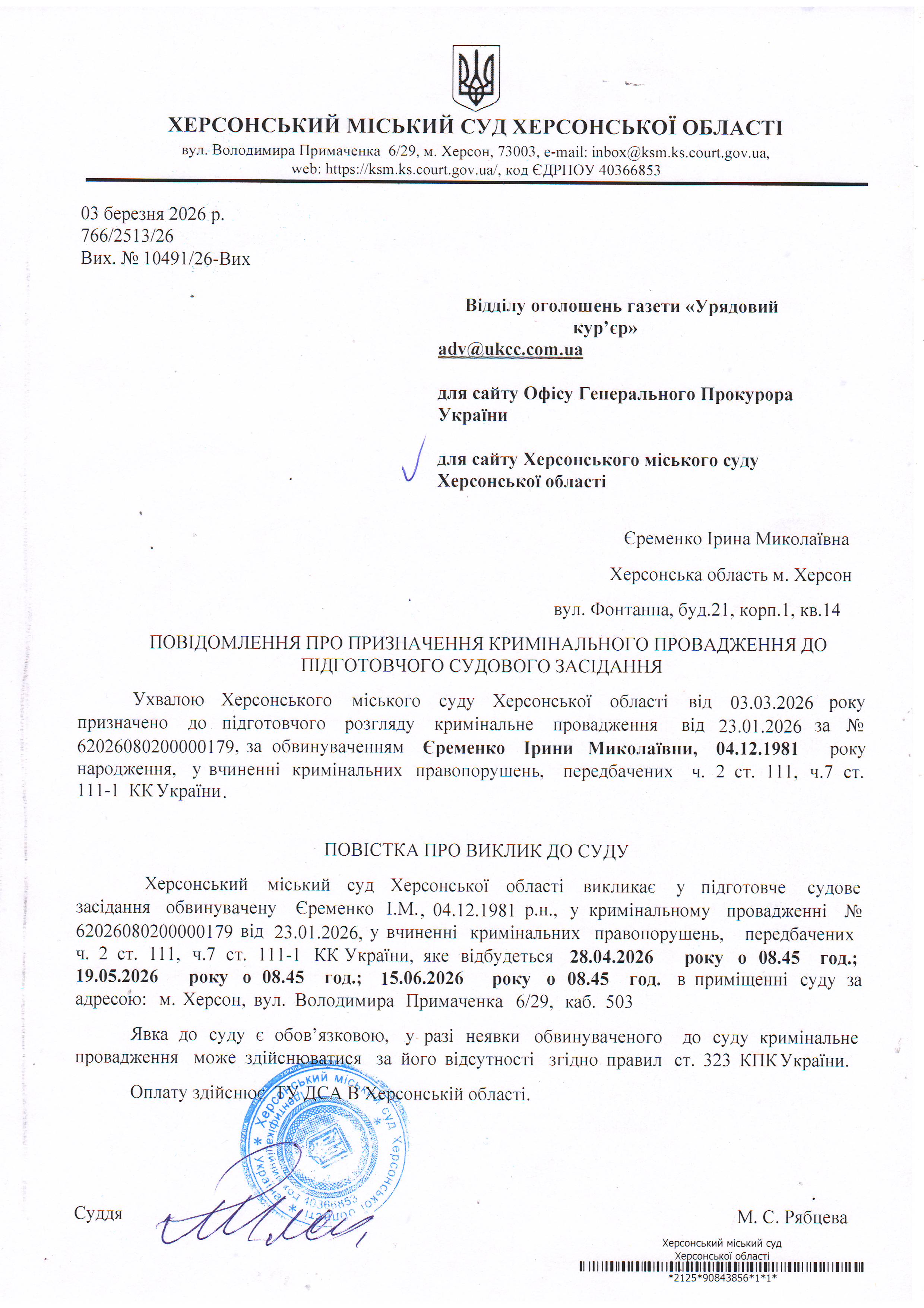Оголошення про виклик особи в суд та повідомлення про судове рішення