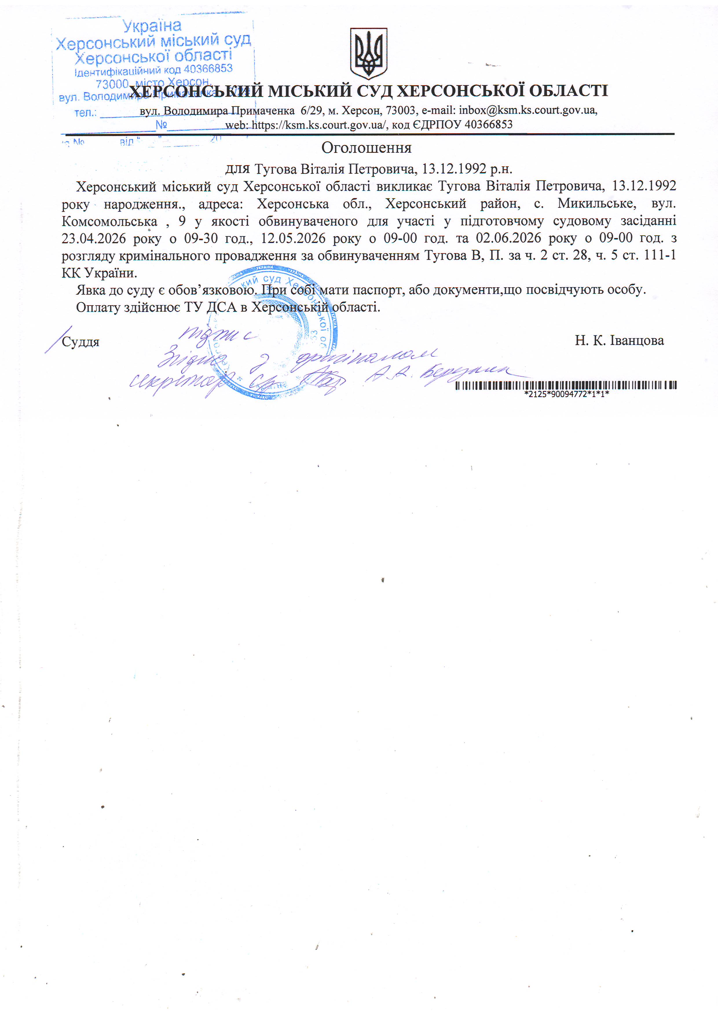ОГОЛОШЕННЯ ПРО ВИКЛИК ДО СУДУ