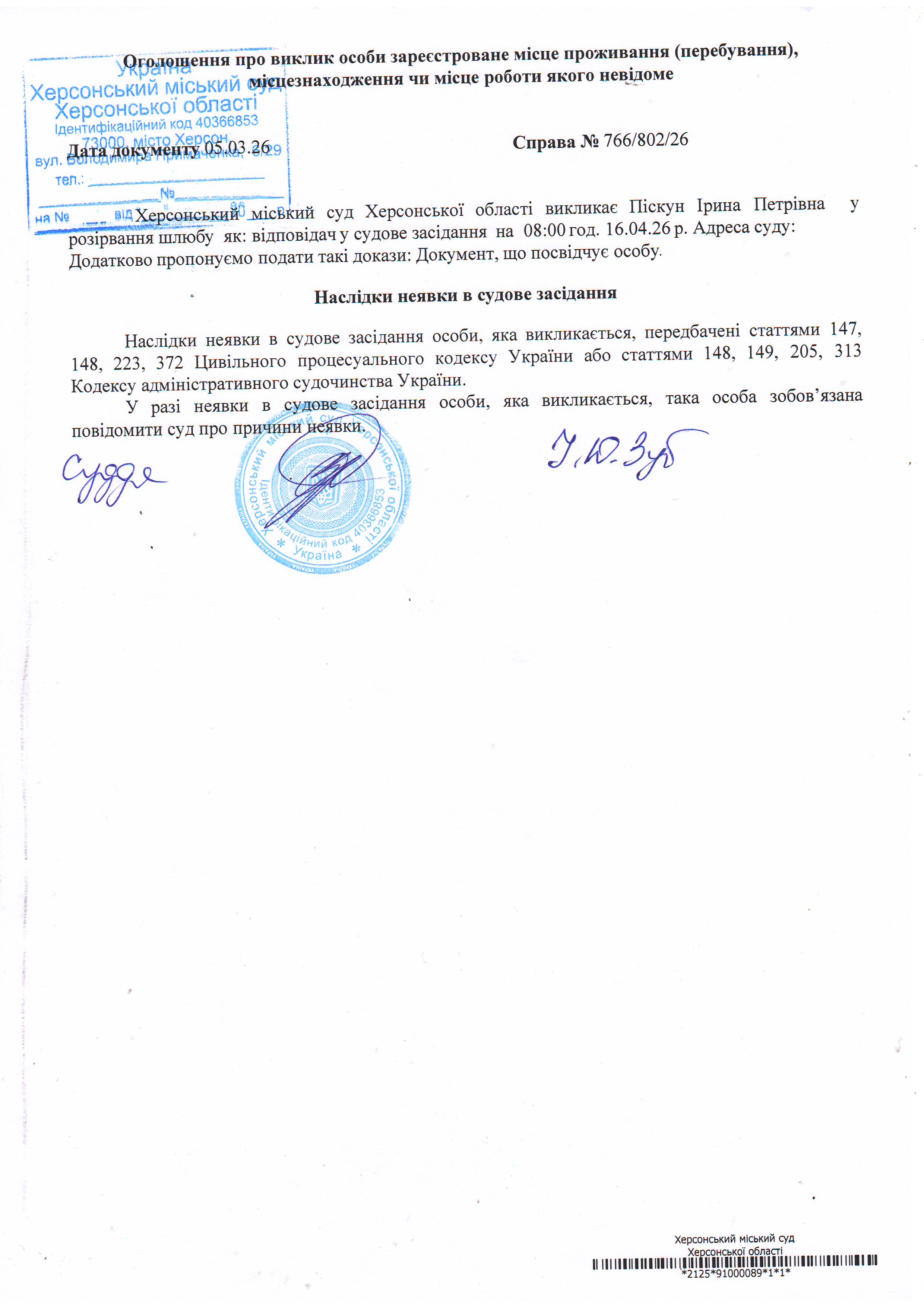 ОГОЛОШЕННЯ ПРО ВИКЛИК ДО СУДУ