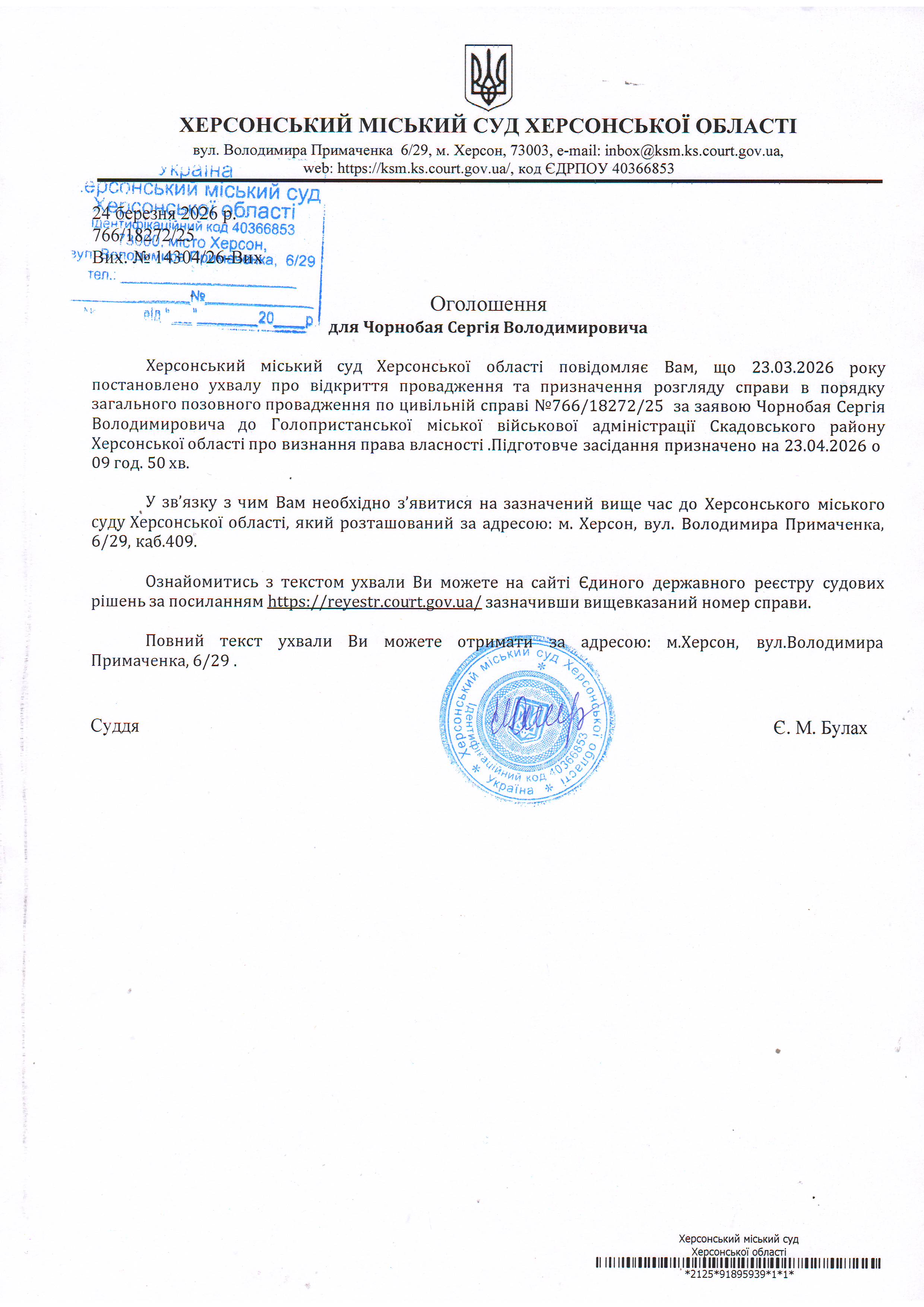 ОГОЛОШЕННЯ, УХВАЛИ ТА ЗАОЧНІ РІШЕННЯ