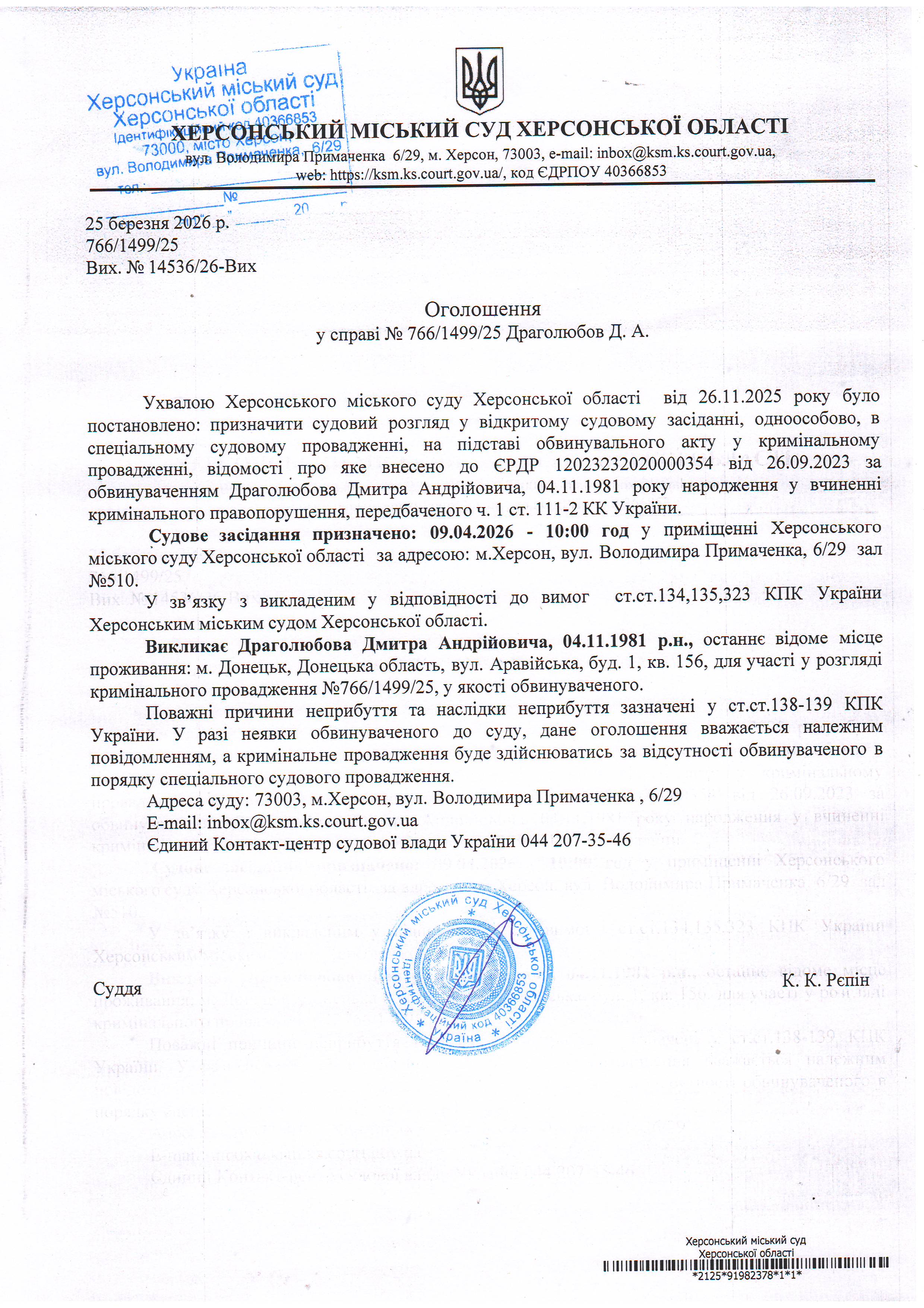 Оголошення про виклик особи в суд та повідомлення про судове рішення