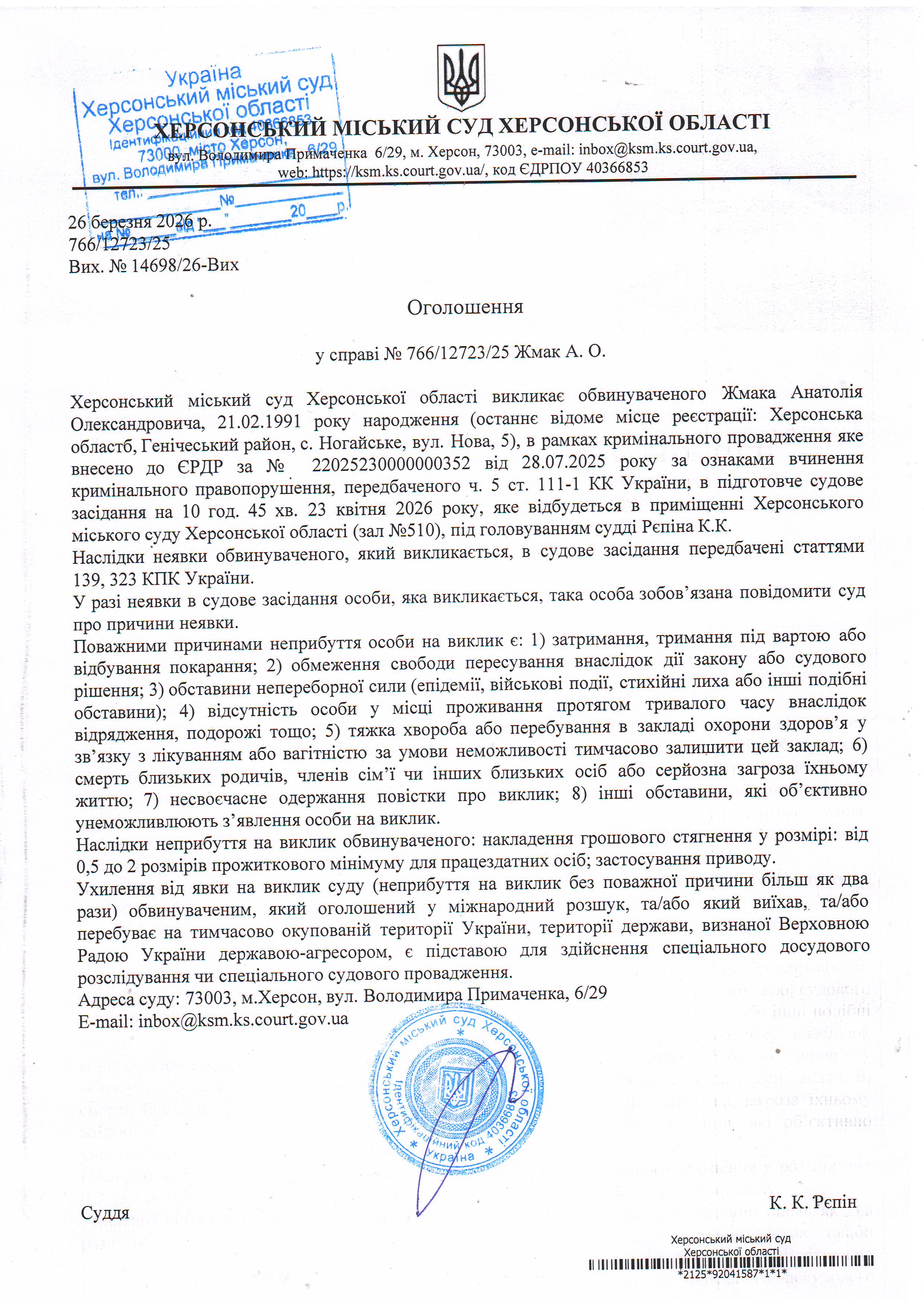 ОГОЛОШЕННЯ ПРО ВИКЛИК ДО СУДУ