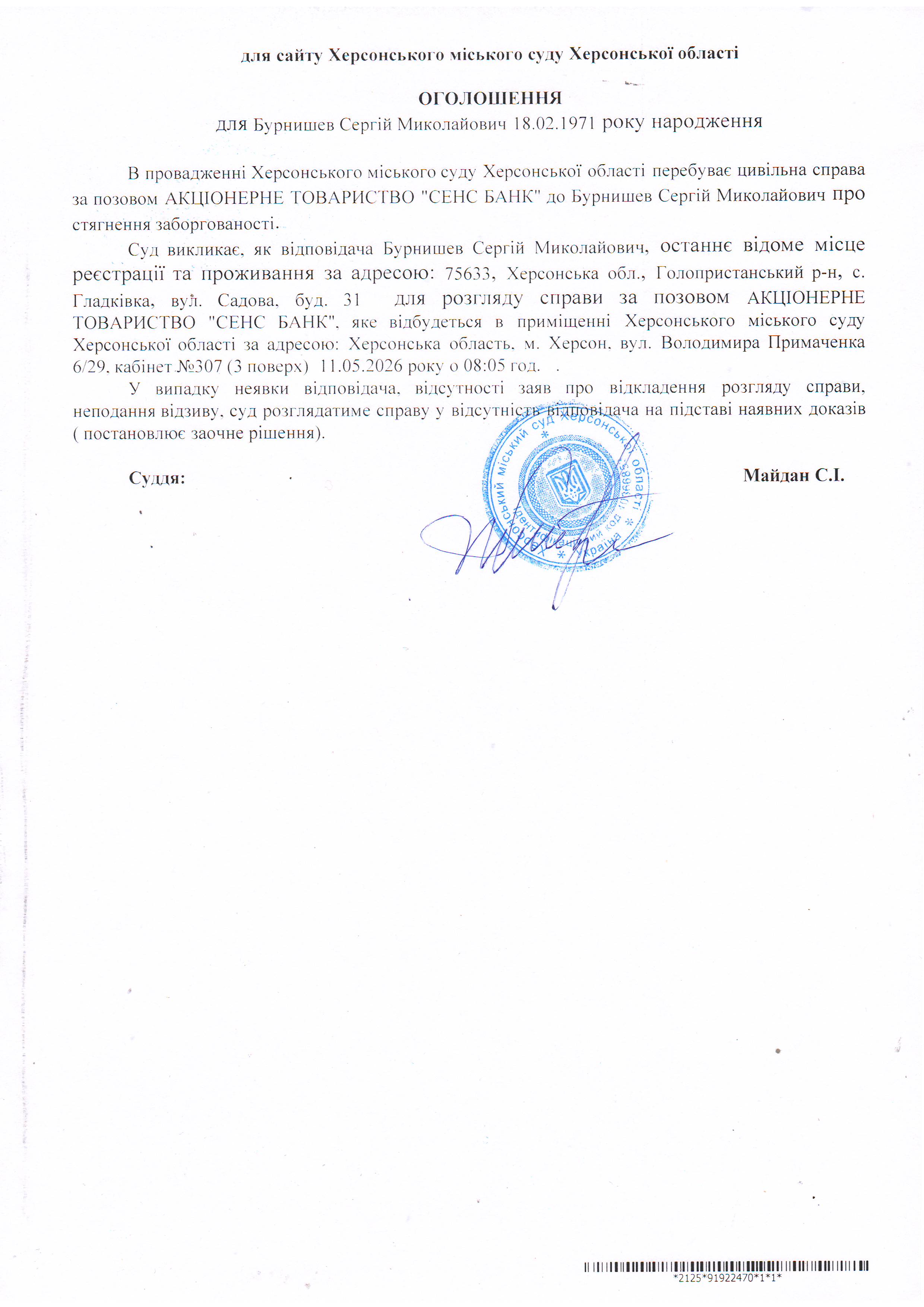 ОГОЛОШЕННЯ ПРО ВИКЛИК ДО СУДУ