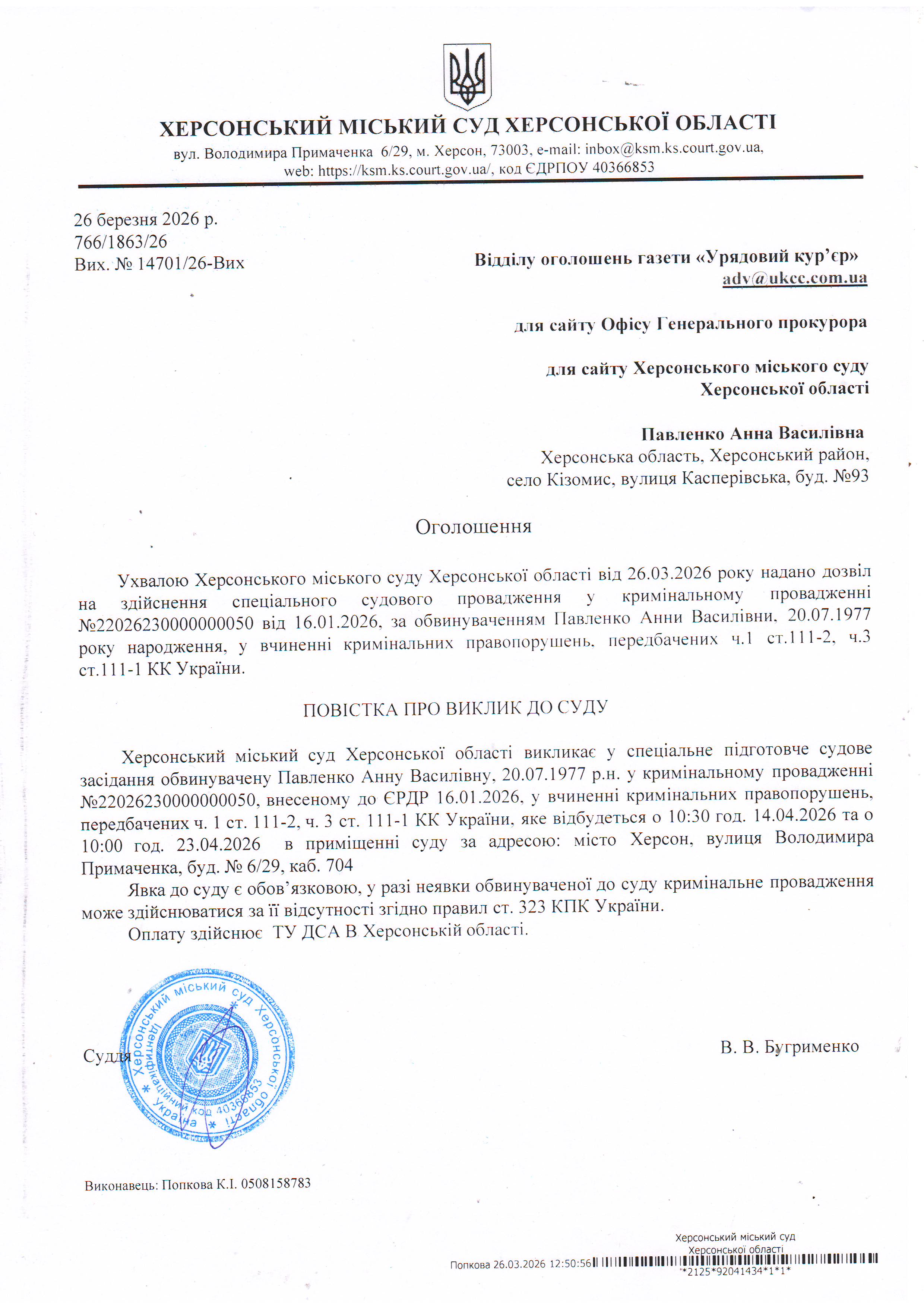 Оголошення про виклик особи в суд та повідомлення про судове рішення
