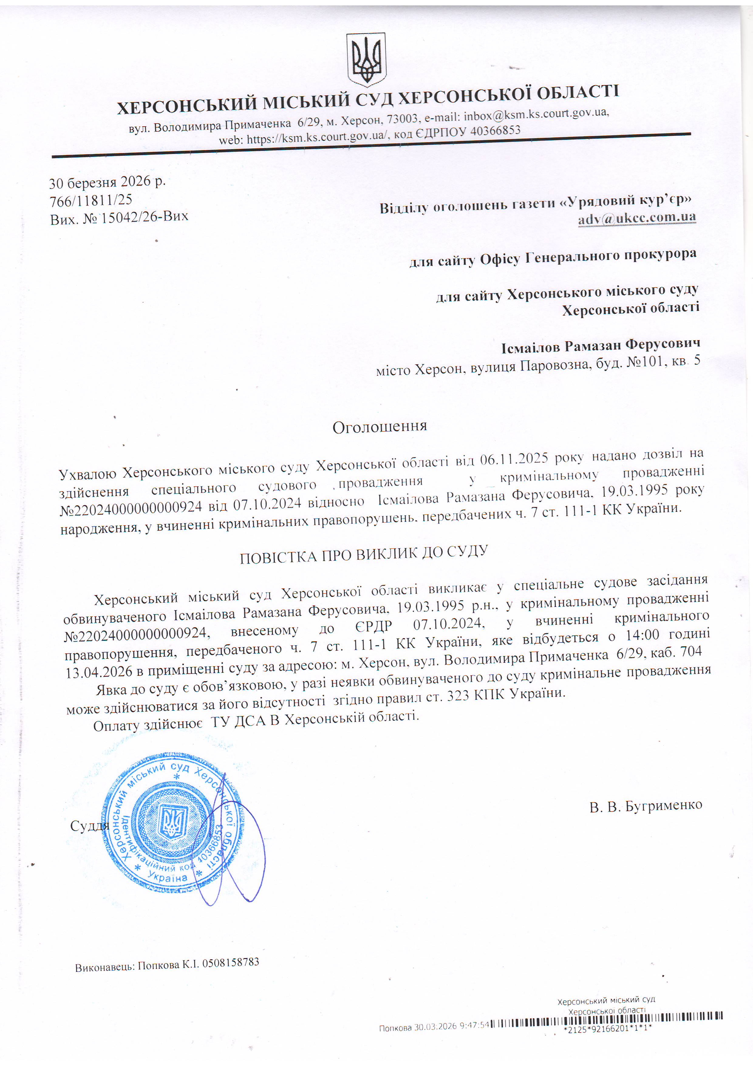 Оголошення про виклик особи в суд та повідомлення про судове рішення